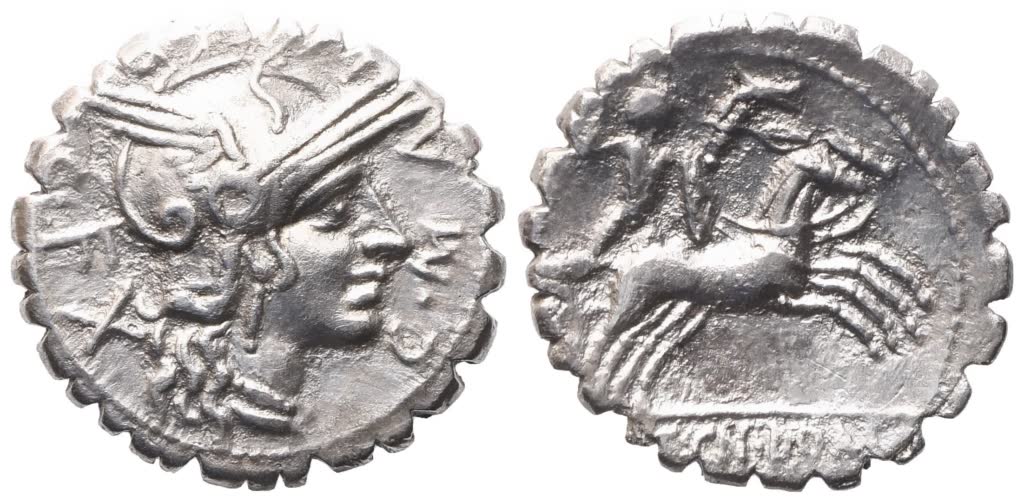 L. Licinius Crassus, Cn. Domitius Ahenobarbus, C. Malleolus, Denarius serratus, 118 BC; AR (3,80 g; 18,7 mm; 4 h)