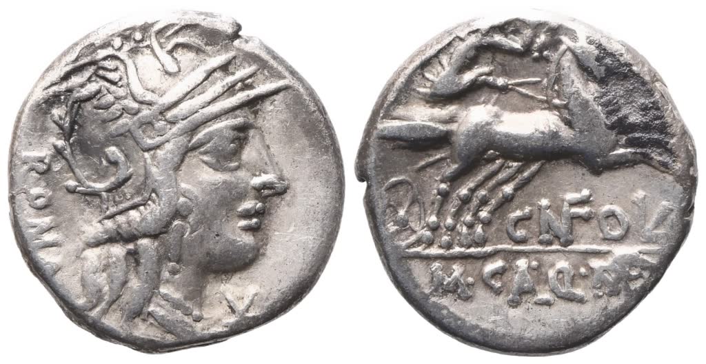 Helmeted head of Roma r.; behind, ROMA; before, * (mark of value); Rv. Victory in biga r., holding reins and wreath; below, CN FOVL (ligate); in exergue, ligate, M·CAL·Q·MET. Crawford 284/1b; Babelon (Calidia) 3, (Caecilia) 36, (Fulvia) 1; Sydenham 539a. Old cabinet tone. Good very fine.
