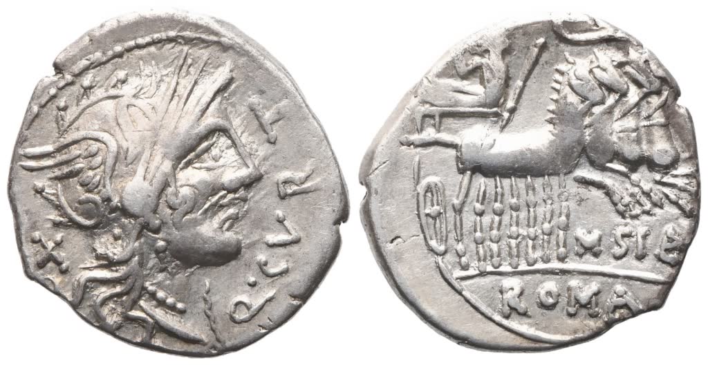Helmeted head of Roma to right; X (mark of value) behind, Q·CVRT upwards before; Rv. Jupiter driving galloping quadriga to r., hurling thunderbolt and holding sceptre, lituus above; M·SILA (LA ligate) below, ROMA in exergue. Crawford 285/2; Babelon (Curtia) 2, (Junia) 9; Sydenham 537. Reverse off-centre, otherwise good very fine.