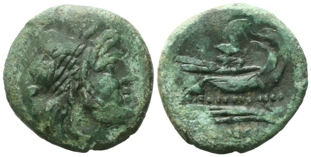 Mint: Rome or uncertain Spanish mint. Laureate head of Saturn right; S (mark of value) to l.; Rv. Prow of galley right; S (mark of value) above, ROMA below. Crawford 339/2; Sydenham 679a. Lovely emerald green patina. Very fine. Rare.