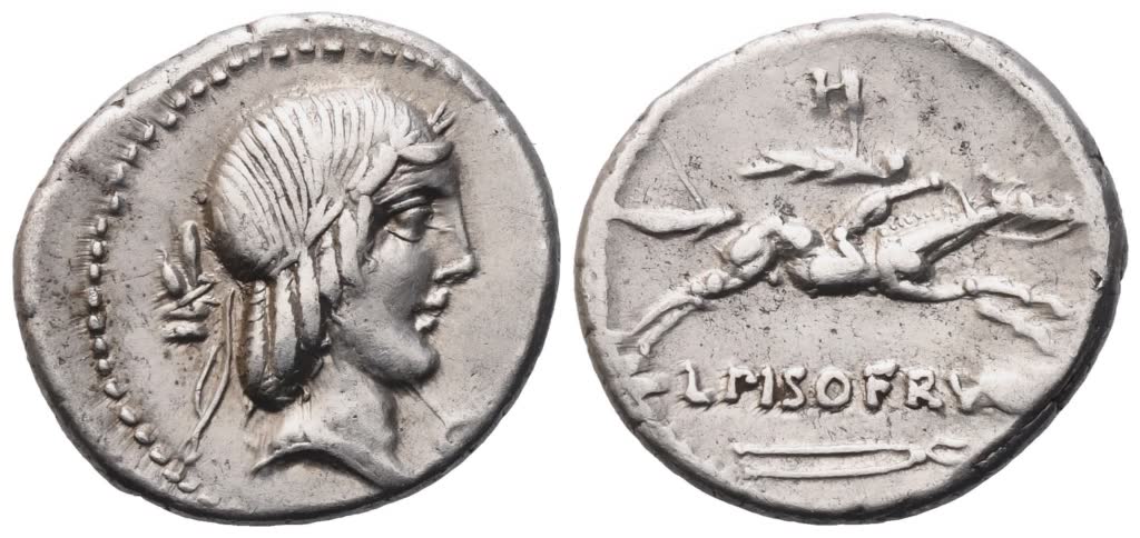 Laureate head of Apollo r.; behind, grasshopper; below chin, C; Rv. Horseman galloping r., holding whip in upraised r. hand; above, H; below, L PISO FRVGI and tongs. Crawford 340/1; Babelon (Calpurnia) 11; Sydenham 669f. Light cabinet tone. Good very fine.