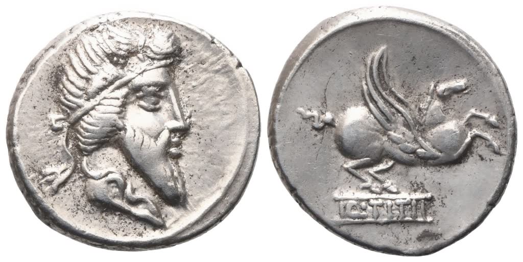 Head of Mutinus Titinus r., wearing winged diadem; Rv. Pegasus springing r.; Q·TITI on tablet below. Crawford 341/1; Babelon (Titia) 1; Sydenham 691. Nice cabinet tone. Good very fine.