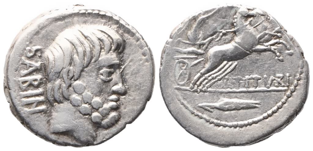 Bearded head of King Tatius r., SABIN behind; Rv. Victory in Biga r., bearing wreath, L TITVRI below, grain ear in exergue. Crawford 344/3; Sydenham 700. Lustre. Very fine.