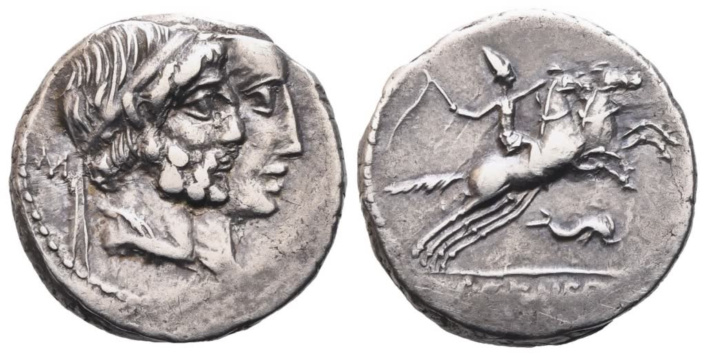 Jugate heads of Numa Pompilius and Ancus Marcius r.; behind, M (control letter); Rv. Two horses r., one with rider; dolphin below. Crawford 346/1c; Babelon (Marcia) 18d. Nice toning. Good very fine.