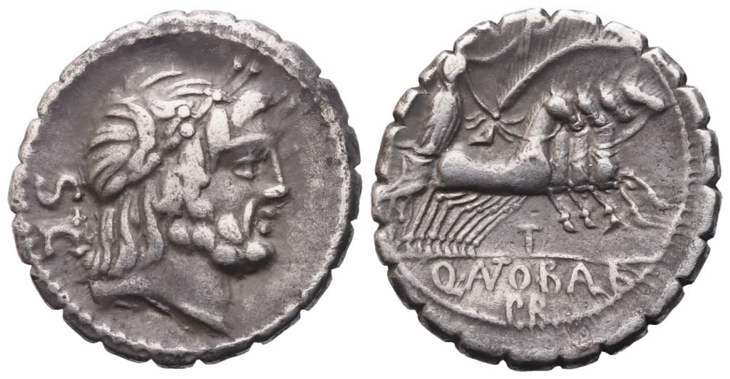 Laureate head of Jupiter r.; behind, S·C; Rv. Victory in quadriga r., holding reins and palm-branch in l. hand and wreath in r.; in exergue, Q·ANTO·BALB / PR. Crawford 364/1a; Babelon (Antonia) 1; Sydenham 742. Dark toning. Good very fine.