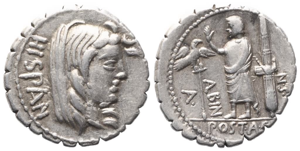 81 BC (Crawford) 82 BC (BMCRR). Head of Hispania r., wearing veil; behind, HISPAN; Rv. A·POST·A·[F]·S·N·ALBIN (AL ligate), togate figure with r. hand raised, standing between legionary eagle and fasces with axe. Crawford 372 /2; Babelon (Postumia) 8; Sydenham 746. Good very fine.