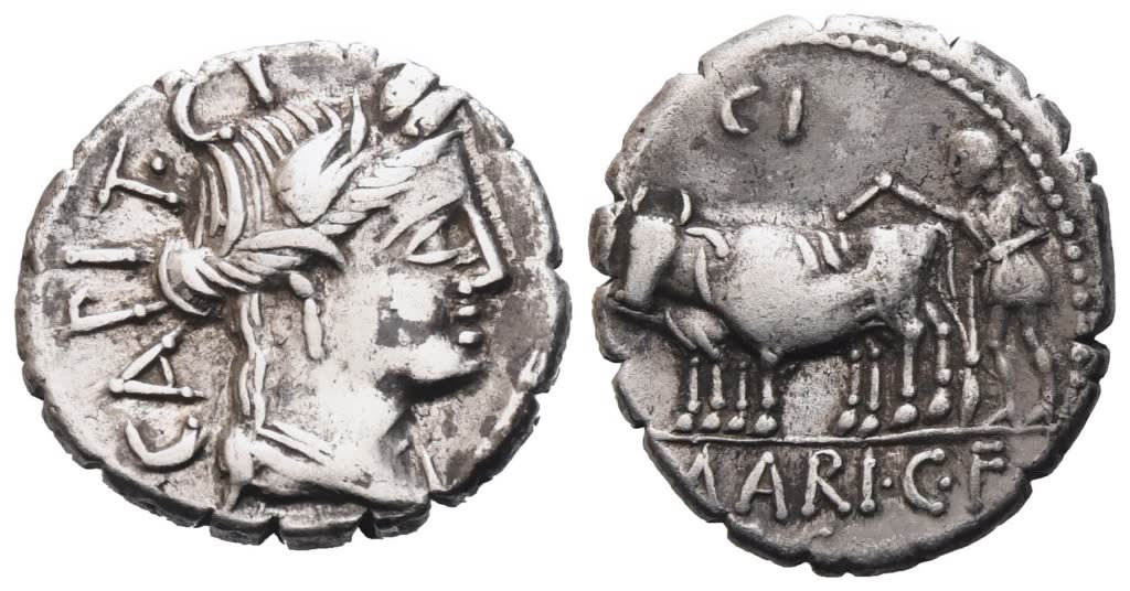 Draped bust of Ceres r.; CAPIT·CI (control mark) behind, symbol below chin; Rv. Ploughman with yoke of oxen to l.; CI (control mark) above, [C]·MARI·C·F / [S·C] in two lines in exergue. Crawford 378/1c; BMCRR Rome 2855-90; Babelon (Maria) 9. Good very fine.
