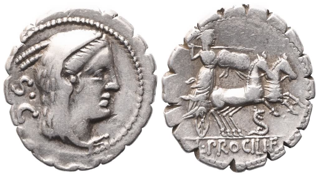 Head of Juno Sospita r., wearing goat skin; S·C to l.; Rv. Juno Sospita, holding spear, shield and reins, driving biga r.; below, serpent coiled r.; in exergue, L·PROCILI·F. Crawford 379/2; Babelon (Procilia) 2; Sydenham 772. Good very fine.