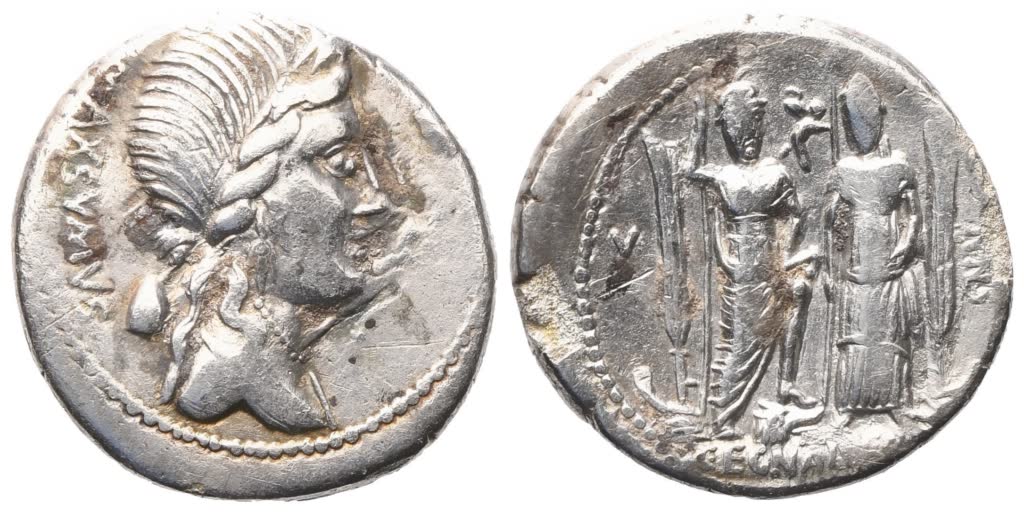 Laureate and diademed bust of Libertas r.; behind, pileus and MAXVMVX downwards; Rv. Roma and Venus standing facing and both holding staff, the former with her l. foot on wolf’s head and the latter has Cupid alighting on her shoulder; on either side, rudders on prow; on l., V (control mark); below, C·EGNATIV[S· CN· F] (AT ligate). Crawford 391/3; Babelon (Egnatia) 3; Sydenham 787. Very fine.