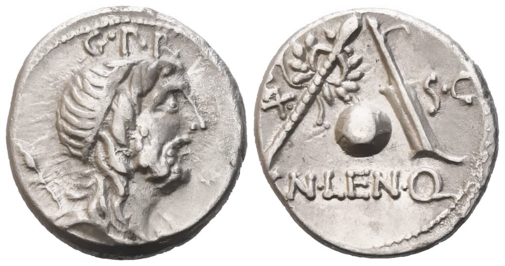 Genius Populi Romani r., draped, hair tied with band, and with sceptre over shoulder; above, G·P·R; Rv. Sceptre with wreath, globe, and rudder; on l., EX; on r., S·C; below, [C]N·LEN·Q. Crawford 393/1a; Babelon (Cornelia) 54; Sydenham 752. Good very fine / about extremely fine.