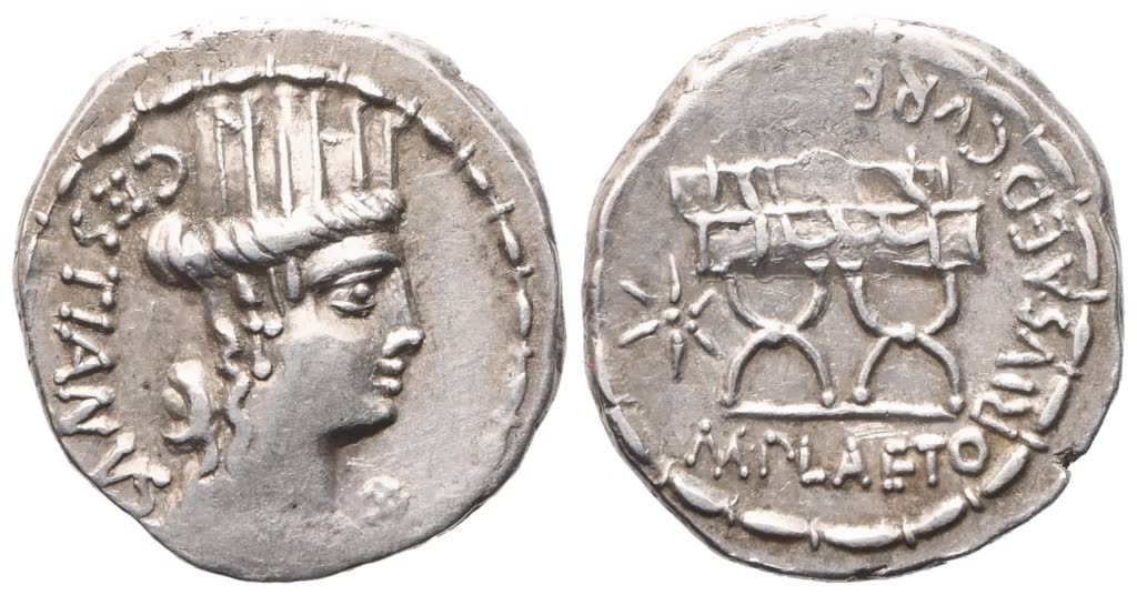Head of Cybele r.; behind, forepart of lion; before, globe; behind, CESTIANVS downwards; Curule chair, on l., star (control mark); around, anticlockwise, M·PLAETORIVS·AED·CVR·E[X·S·C]. Crawford 409/2. Good very fine / about extremely fine.