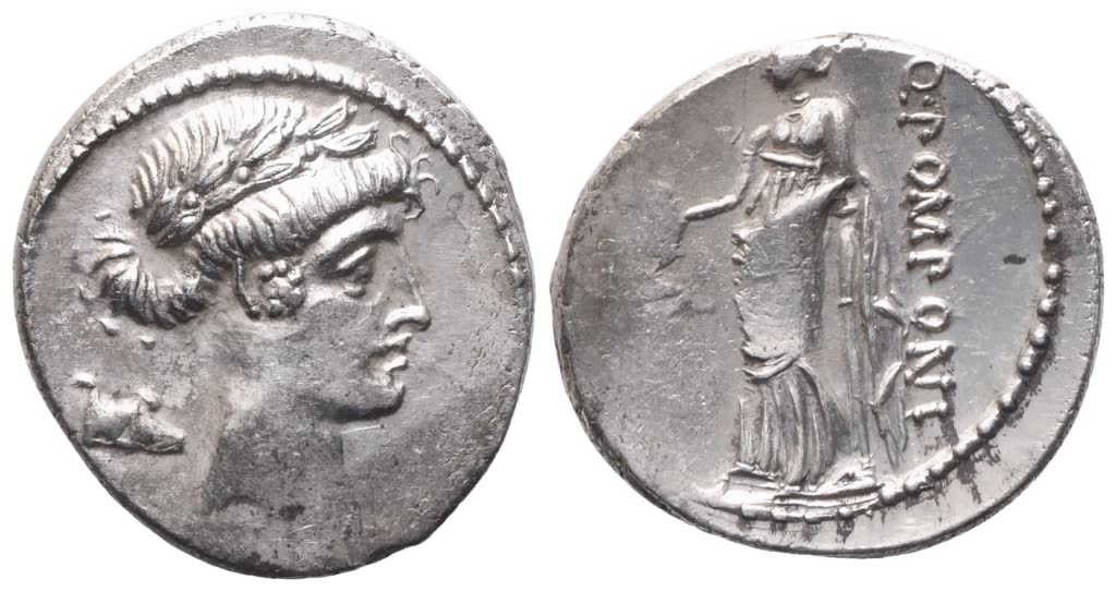 Laureate head of Apollo r.; sandal to l.; Rv. Thalia standing l. and leaning on column, holding persona (comic mask); on r., Q·POMPONI downwards; on l., [MVSA] downwards. Crawford 410/9b; Babelon (Pomponia) 19; Sydenham 821. Appealing old cabinet tone. Minor areas of flatness, otherwise good very fine.