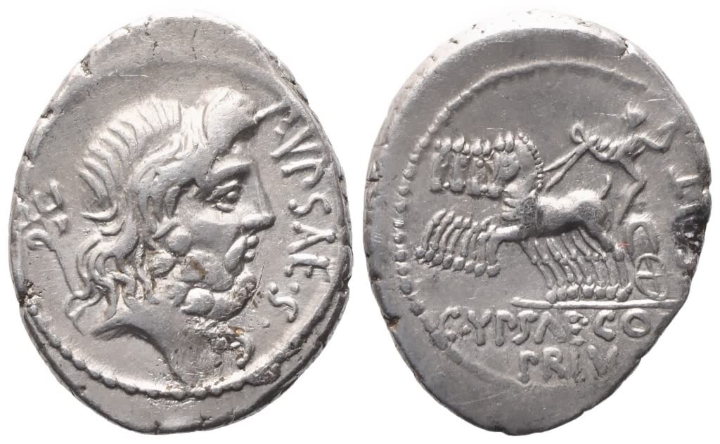 Head of Neptune r.; behind, trident; before, P·YPSAE·S·C dwonwards; Rv. Jupiter in quadriga l., holding reins in l. hand and hurling thunderbolt with r. hand; behind, CEPIT upwards; in exergue, C·YPSAE·CO[S] / PRIV in exergue. Crawford 420/1a; Babelon (Plautia) 11; Sydenham 910. Lovely cabinet tone. Very fine.