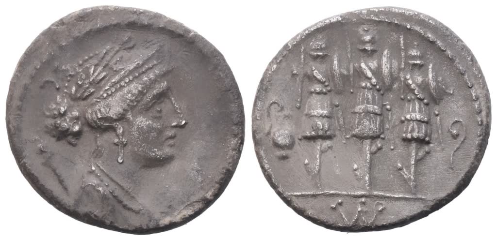 Bust of Venus r., draped, laureate and wearing diadem; behind, sceptre; behind, S·C downwards; Rv. Three trophies; on l., jug; on r., lituus; in exergue, FAVSTVS monogram. Crawford 426/3; Babelon (Cornelia) 63; Sydenham 884. Deep, dark toning. Very fine.
