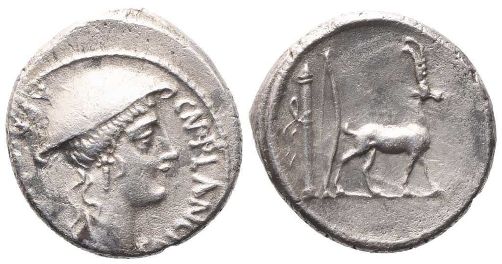Head of Diana Planciana r., wearing petasus; before, CN·PLANCIV[S] downwards; behind, AED·CVR·S·C downwards; Rv. Cretan ibex standing r., bow and quiver behind. Crawford 432/1; Babelon (Plancia) 1; Sydenham 933. Very fine.