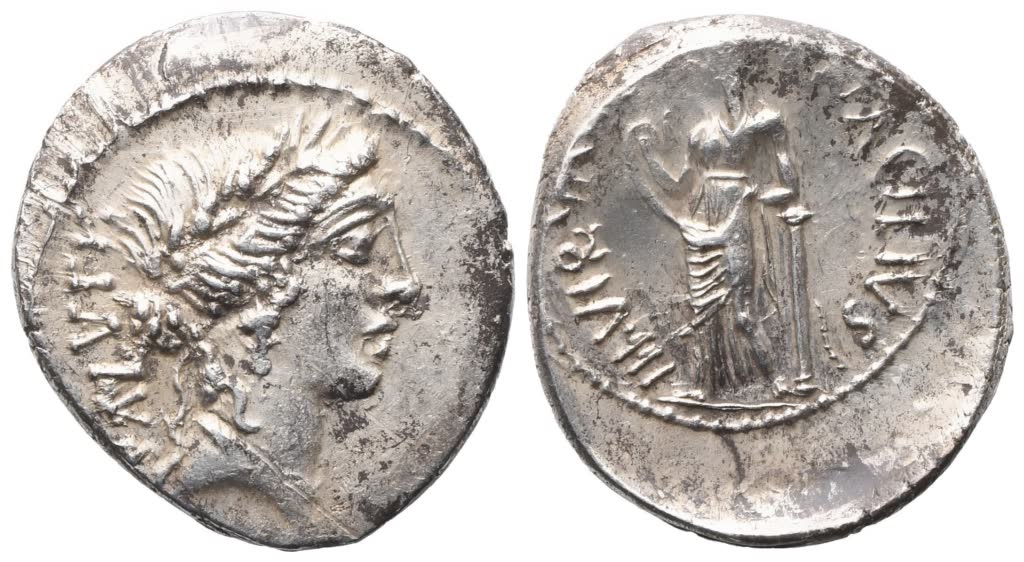 Laureate head of Salus r.; SALVTIS upwards to l.; Rv. Valetudo (Salus) standing l., holding snake and leaning elbow on column; on r. MN·ACILIVS (MN ligate) downwards; on l., III·VIR VA[LETV] upwards. Crawford 442/1a; Babelon (Acilia) 8; Sydenham 922. Slightly off-centre, otherwise good very fine.