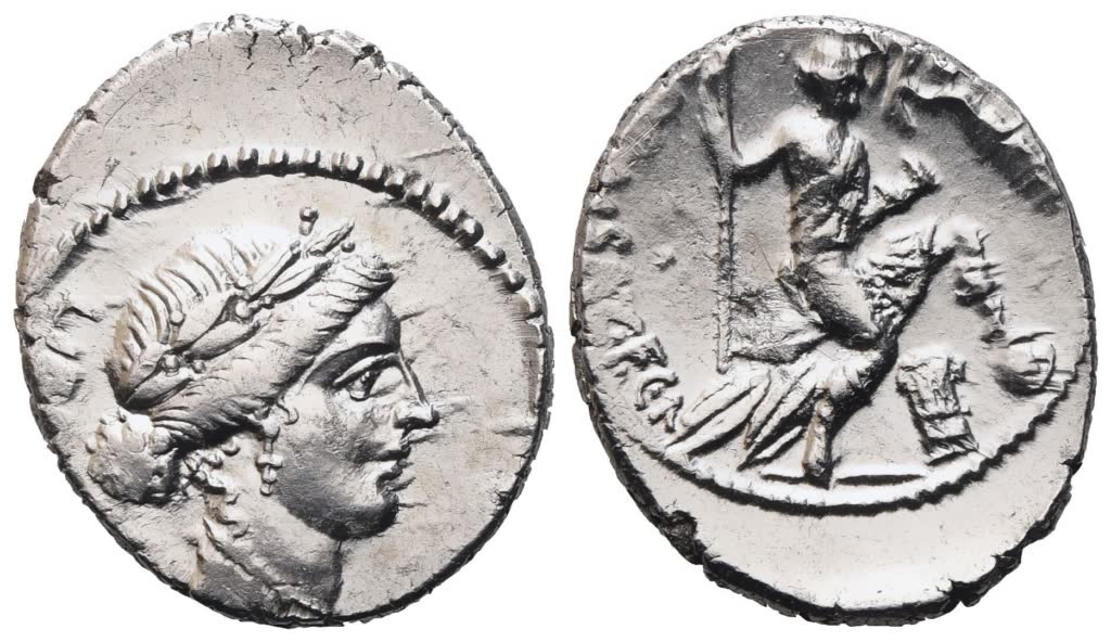 48 BC (RRC) 49 BC (BMCRR). Laureated head of Libertas r.; behind, LIB[ERTATIS]; Rv. Roma, r. breast bare, seated r. on pile of arms, wearing helmet, holding sceptre in r. hand and placing l. foot on globe; on r., flying Victory crowning Rome; on l., [C·PA]NSA·C·F·N. Crawford 449/4; Babelon (Vibia) 20; Sydenham 949. Slightly off-centre, otherwise good very fine. Shiny surfaces.