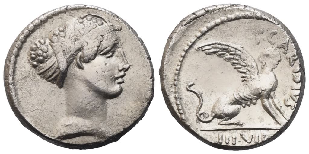 Head of the Sibyl Herophile to r., hair elaborately decorated with jewels and enclosed in a sling and tied with band; Rv. Sphinx seated to r.; above, T·CARISIVS; in exergue, III·VIR. Crawford 464/1; Babelon (Carisia) 11; Sydenham 983a. Nicely toned. Good very fine.