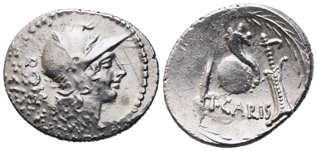 Helmeted head of Roma r., wearing Attic helmet with plume; behind, ROMA Downwards; border of dots; Rv. Cornucopia on globe; on l., sceptre; on r., rudder; below, T·CARIS; all within laurel wreath. Crawford 464/3a; Babelon (Carisia) 4; Sydenham 984. A few scratches, otherwise very fine. Lustrous metal.