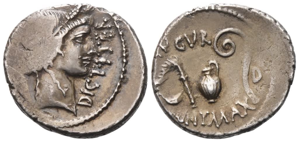 Mint: North Africa (Utica?). Head of Ceres r., wreathed with grain ears; [to l., COS·TERT downwards]; to r., DICT·ITER upwards; Rv. Culullus, aspergillum, jug, and lituus; D in r. field; above, AVGVR; below, PONT·MAX. Crawford 467/1a; Babelon (Julia) 16; Sydenham 1024. Deep cabinet tone. Very fine.