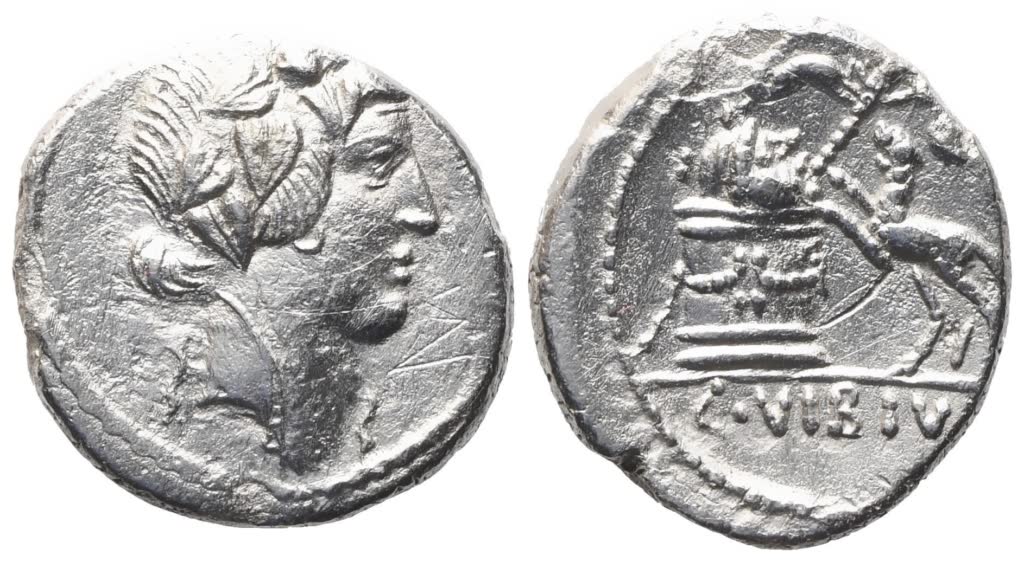 Head of Bacchus r. wearing ivy wreath; Rv. Panther springing l. towards altar, mask atop altar and thyrsus leaning against it, C·VIBIV[S] in exergue, [VARVS] at r. Crawford 494/36; Babelon (Vibia) 24; Sydenham 1138. A few scratches. Very fine / good very fine.