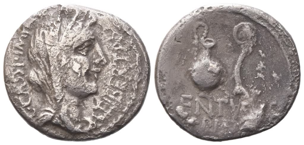 Military mint moving with Brutus and Cassius, probably at Smyrna. P. Lentulus Spinther, legate. Veiled, diademed, and draped bust of Libertas r.; around, C·CASSI·IMP – LEIBERTAS; Rv. Jug and lituus; below, LENTVLVS SPINT. Crawford 500/5; Sydenham 1305; CRI 223; RSC 6. Near very fine.