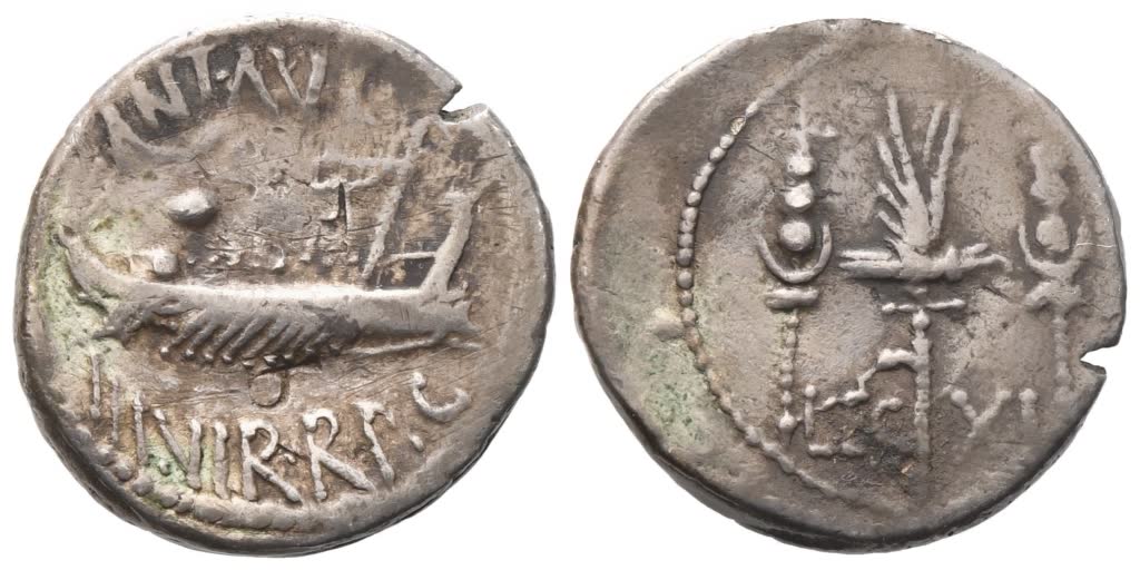 Military mint moving with Mark Antony (Patrae?). Praetorian galley moving to r.; above, ANT·AVG; below, III·VIR·R·P·C; Rv. Legionary eagle between two standards; LEG XI across lower field. Crawford 544/25; Babelon (Antonia) 118; Sydenham 1229. Test cuts on the obverse. Very fine.