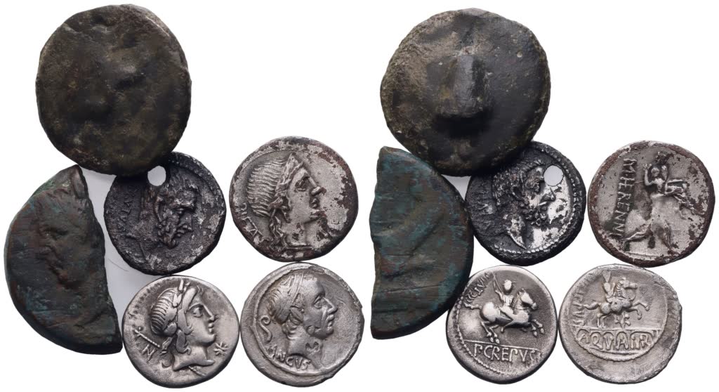 Precedente Lotto 493 Successivo Bertolami Fine Art - Máchova 838, Vinohrady 18, 120 00 Prague Auction 331 | RES PVBLICA RES PVBLICA giovedì 27 marzo 2025 ore 14:00 (UTC +01:00) Lot of 6 Roman Republican AR and Æ coins Lot to be sold as is. No return.