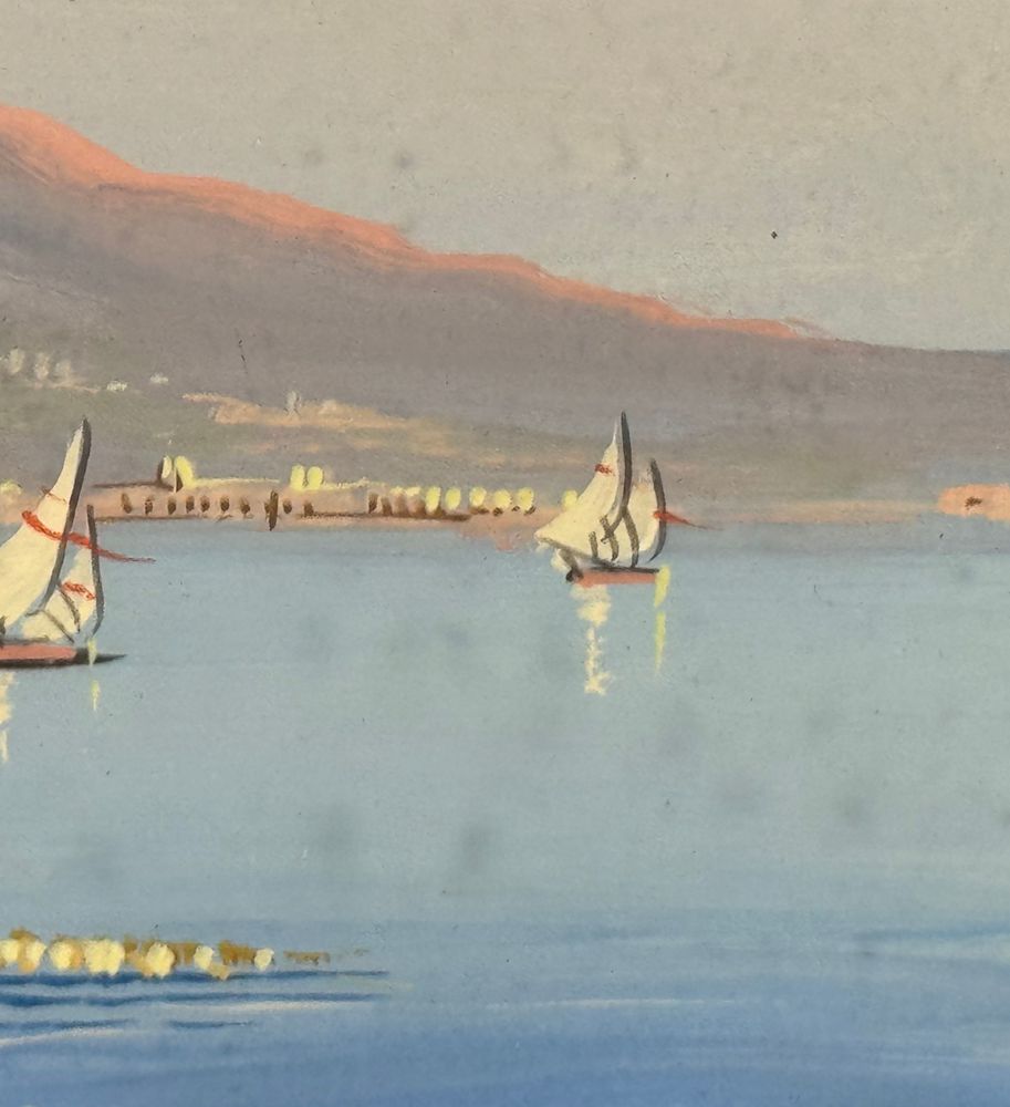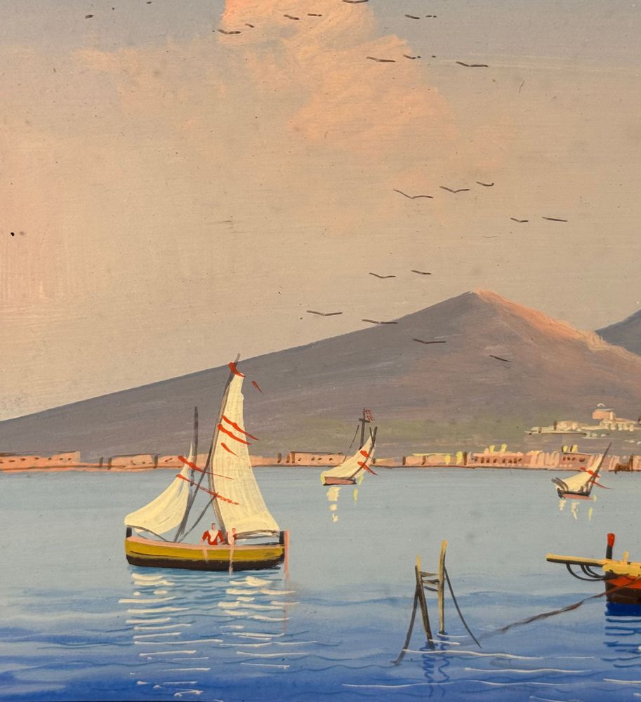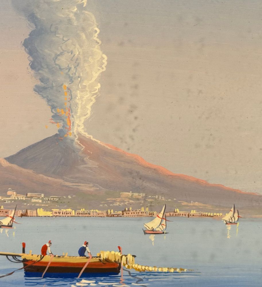 Dipinto guazzo (tempera su carta), periodo XX secolo scuola Italiana, raffigurante Il Vesuvio visto dal mare. Dimensioni compreso cornice: 60x52 cm. Dimensioni interno cornice: 37x29 cm. Artista anonimo. Opera in buone condizioni.