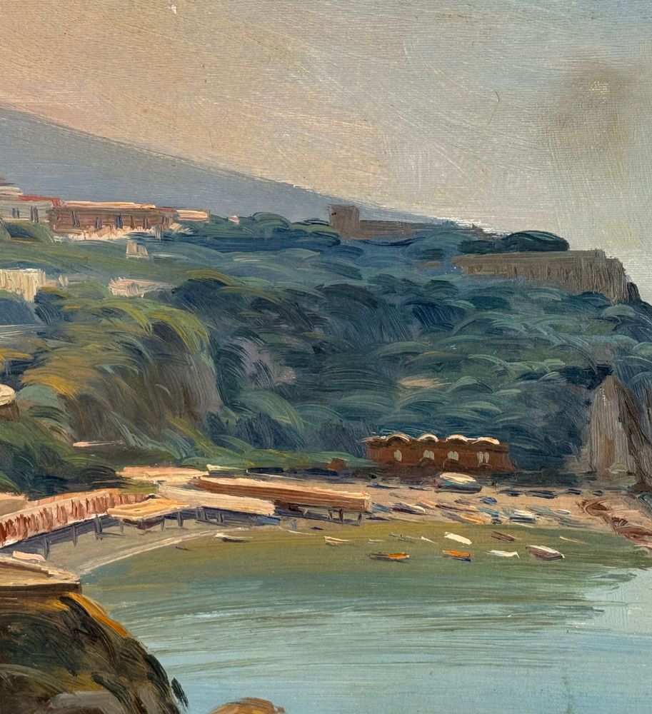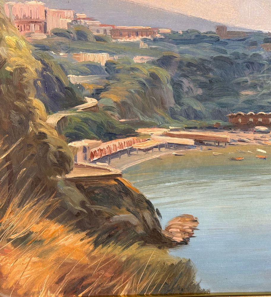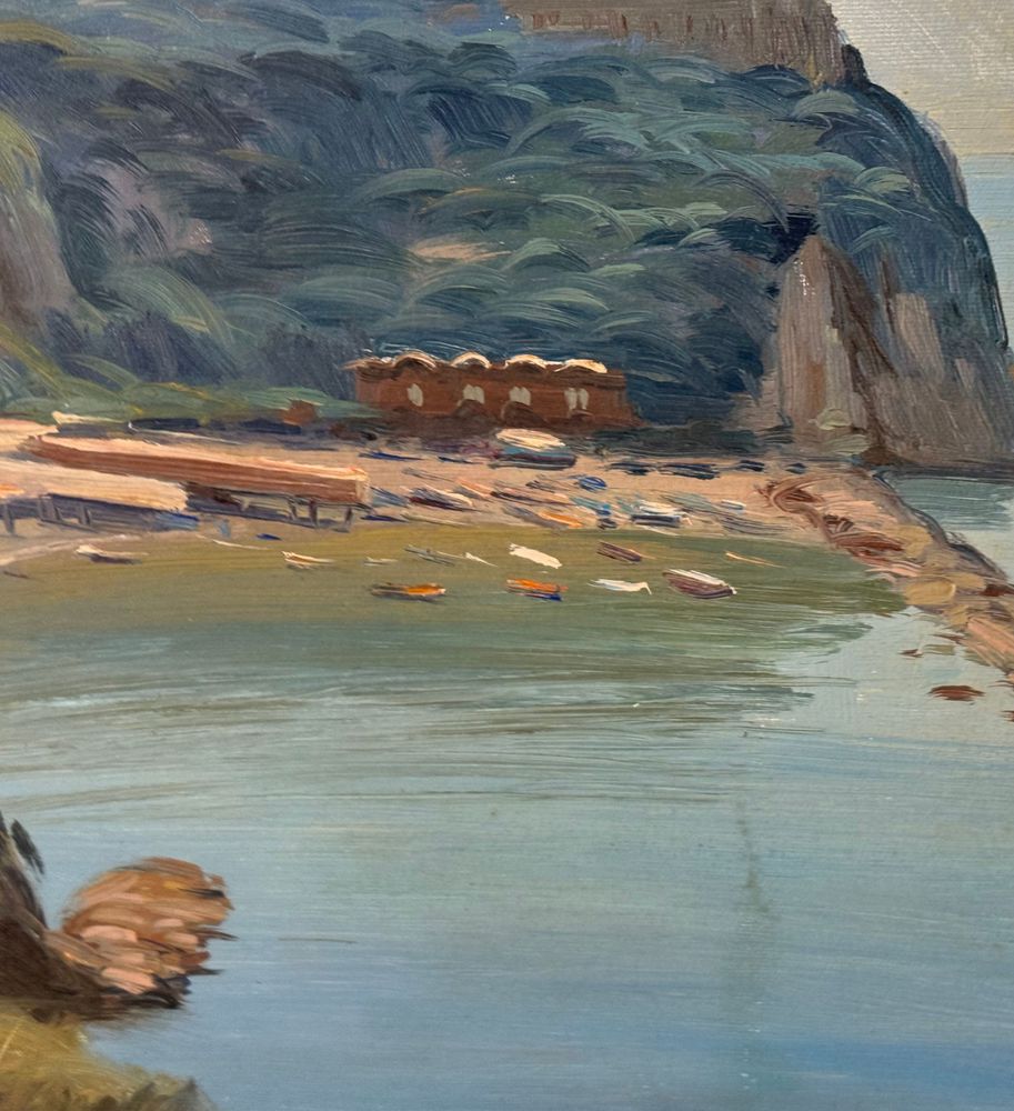 Dipinto olio su tela, periodo XX secolo scuola Italiana, raffigurante Scorcio di marina partenopea. Dimensioni compreso cornice: 73x83 cm. Dimensioni interno cornice: 60x50 cm. Reca firma in basso a destra Giovanni Parlato. Opera in buone condizioni.
