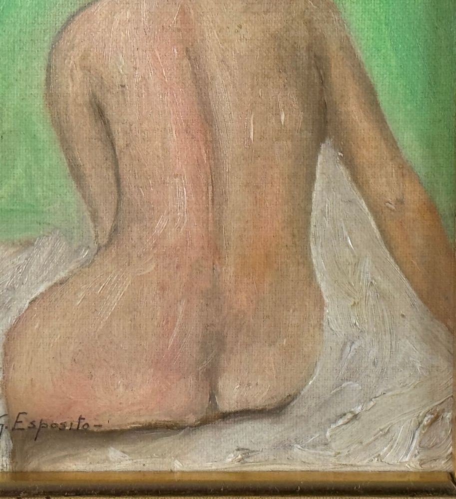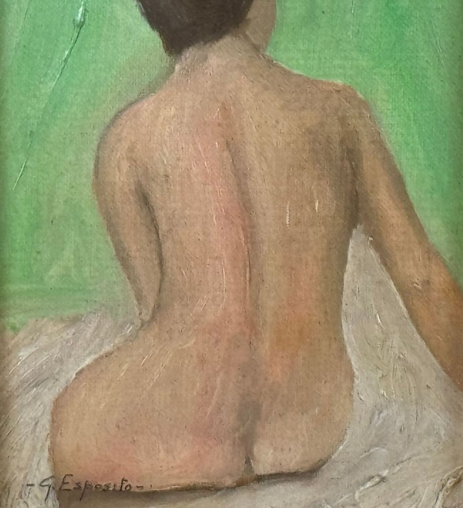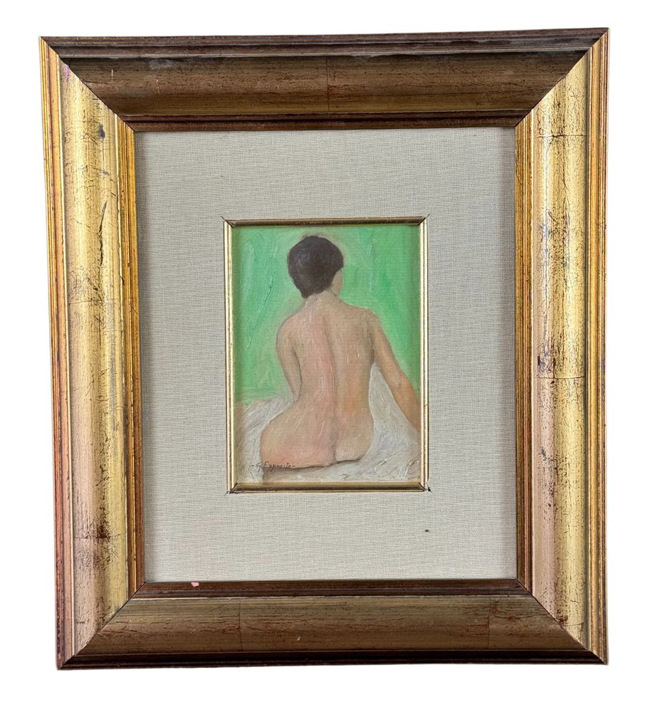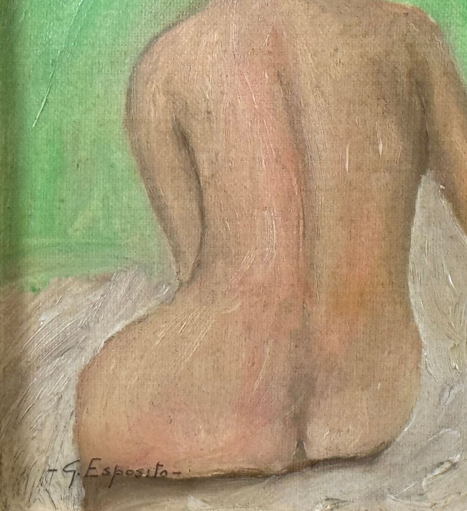 Dipinto olio su pannello, periodo XX secolo, scuola Italiana, raffigurante Nudo di donna ritratta di spalle. Dimensioni compreso cornice: 40x35 cm. Dimensioni interno cornice: 18x13 cm. Reca firma in basso a sinistra G. Esposito. Opera in buone condizioni.
