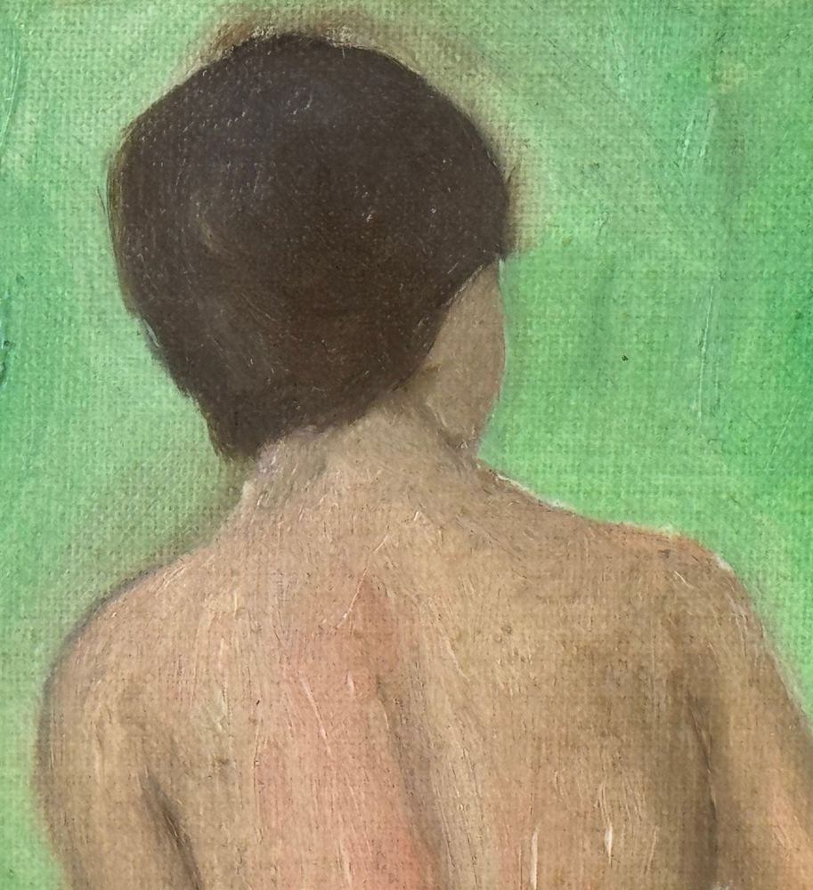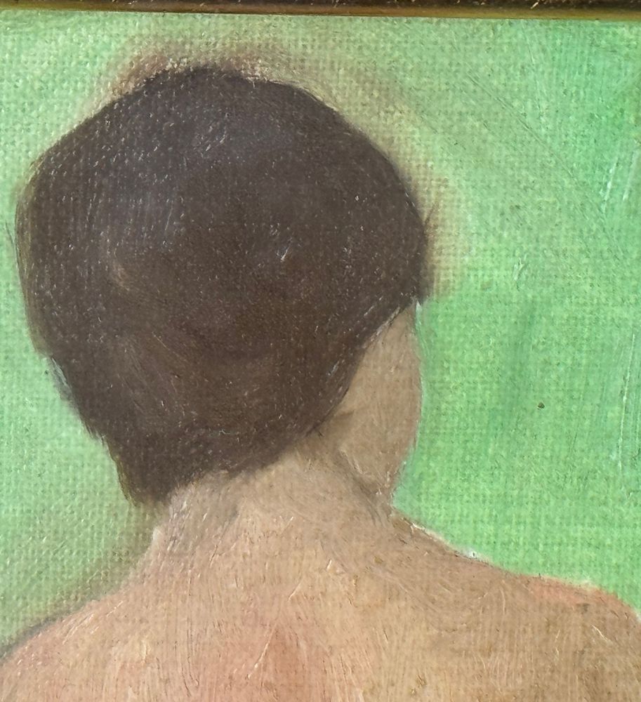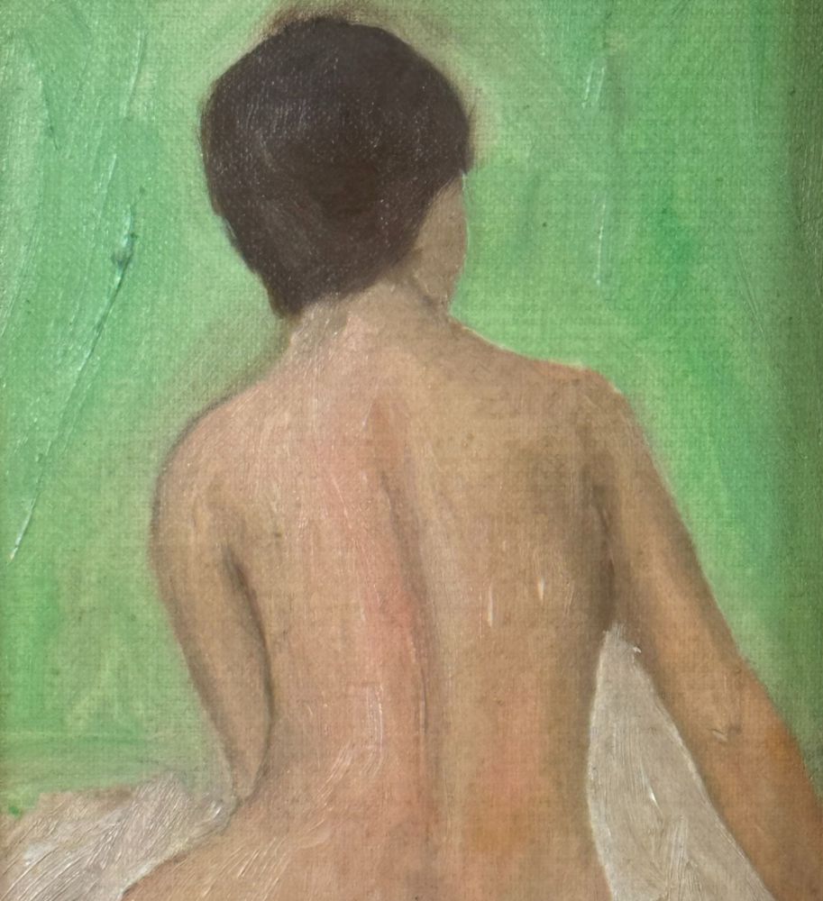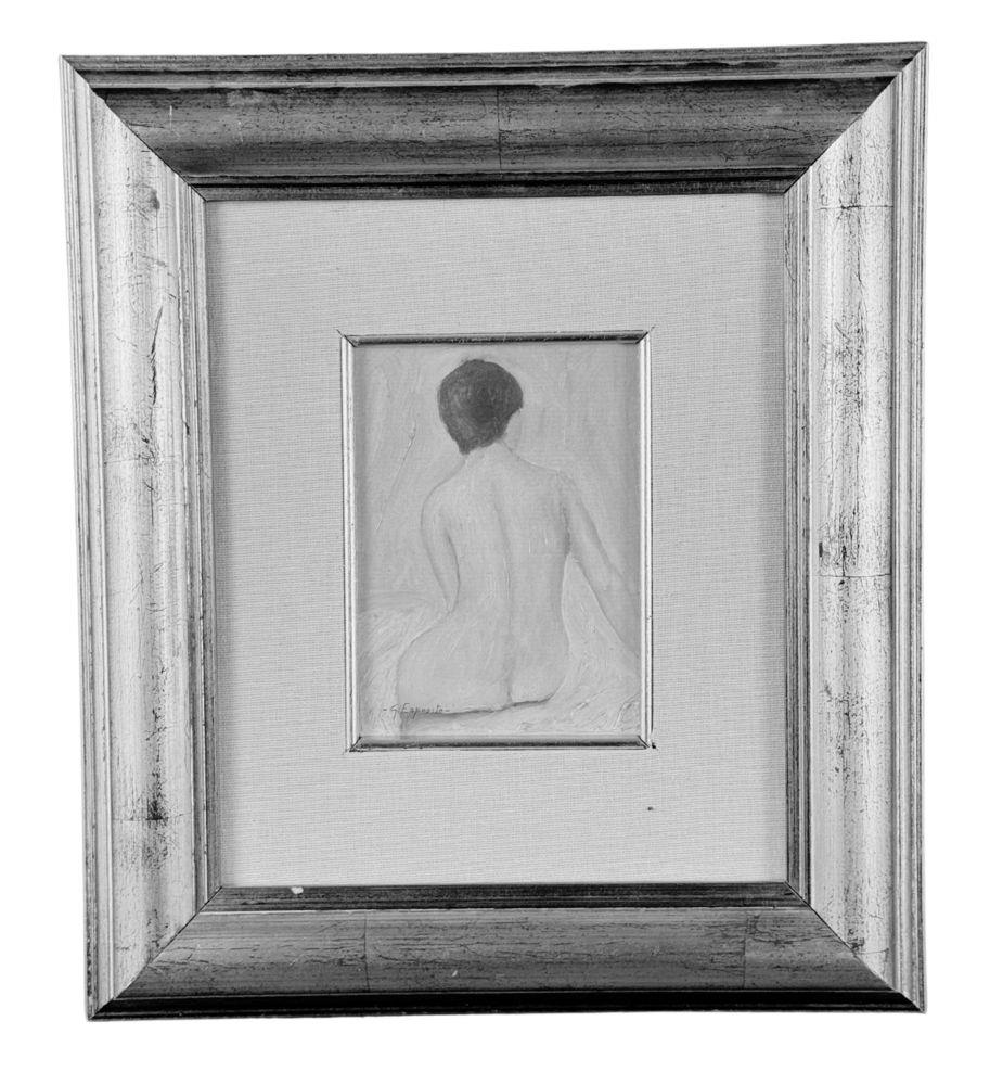Dipinto olio su pannello, periodo XX secolo, scuola Italiana, raffigurante Nudo di donna ritratta di spalle. Dimensioni compreso cornice: 40x35 cm. Dimensioni interno cornice: 18x13 cm. Reca firma in basso a sinistra G. Esposito. Opera in buone condizioni.