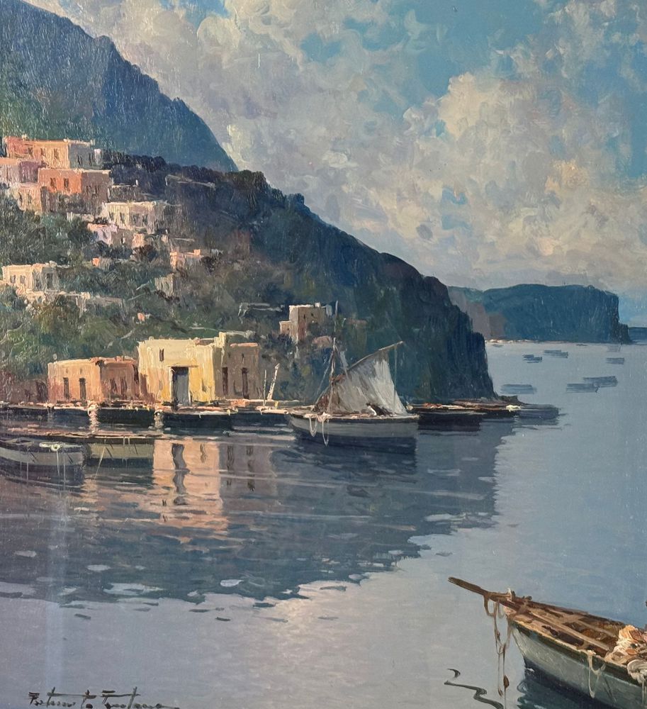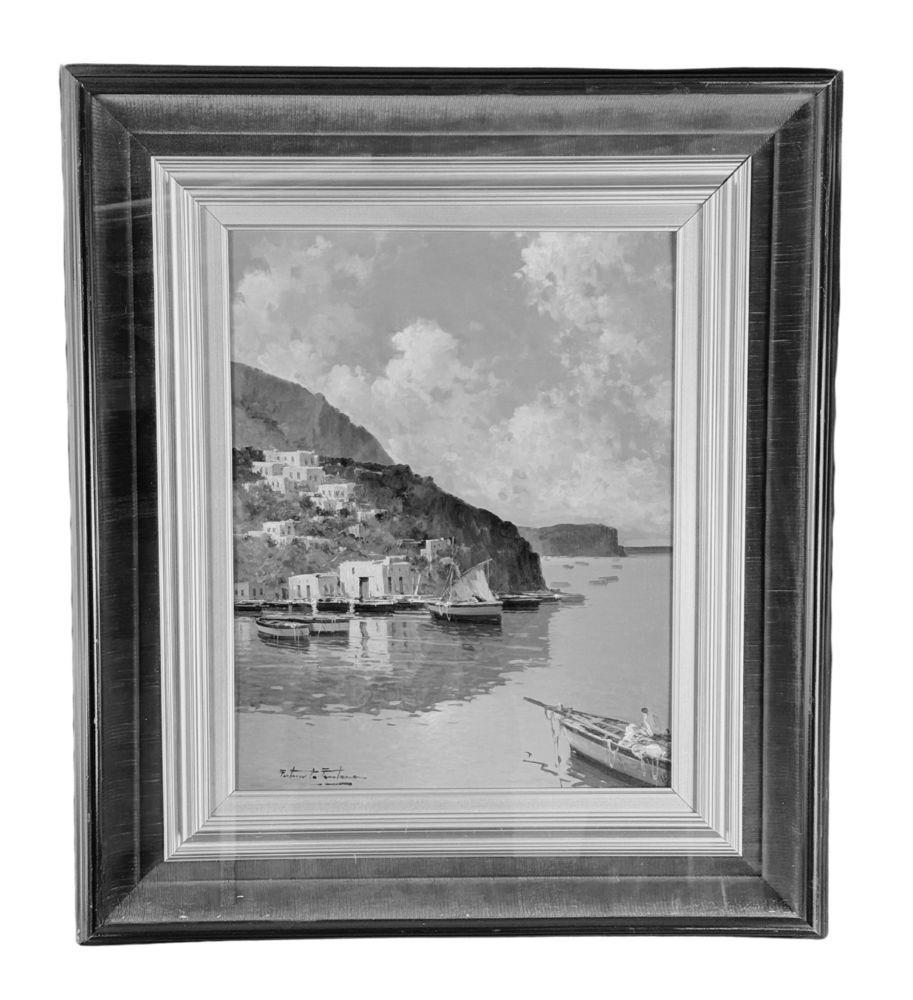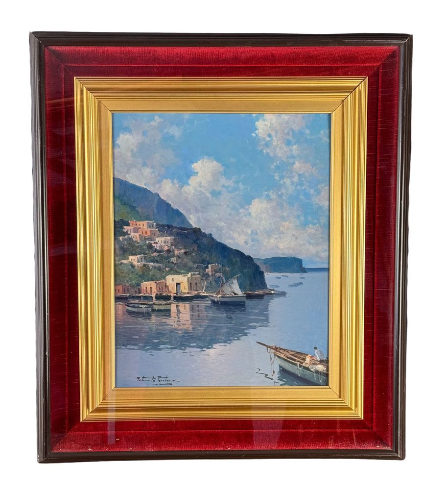 Dipinto olio su tavola, periodo XX secolo, scuola Italiana, raffigurante Scorcio di marina napoletana. Dimensioni compreso cornice: 65x75 cm. Dimensioni interno cornice: 50x40 cm. Reca firma in basso a sinistra Fortunato Fontana. Opera in buone condizioni.