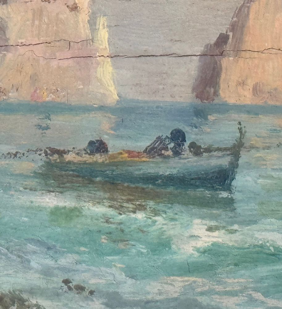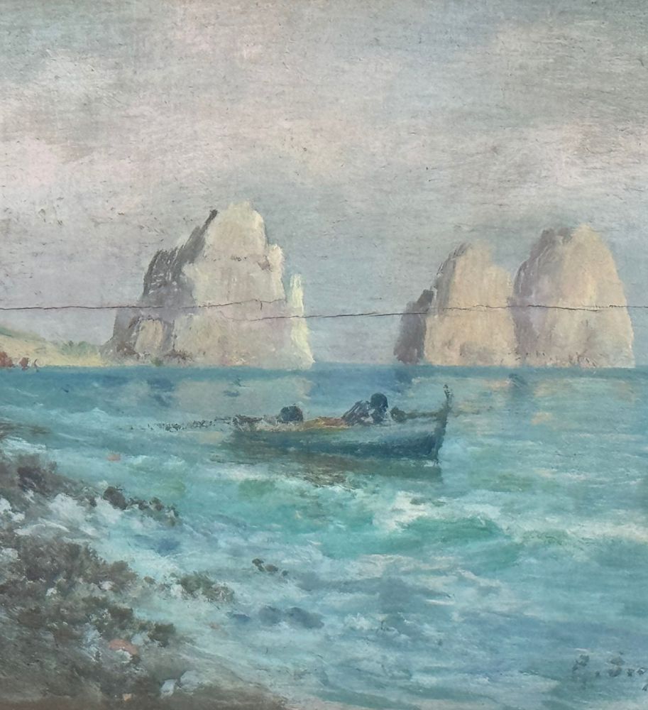 Dipinto olio su cartoncino, periodo XX secolo, scuola Italiana, raffigurante Scorcio di marina a Capri. Dimensioni compreso cornice: 44x40 cm. Dimensioni interno cornice: 11,5x16 cm. Reca firma in basso a destra Scoppa. Opera in buone condizioni con lievi segni di vissuto come da foto allegate.