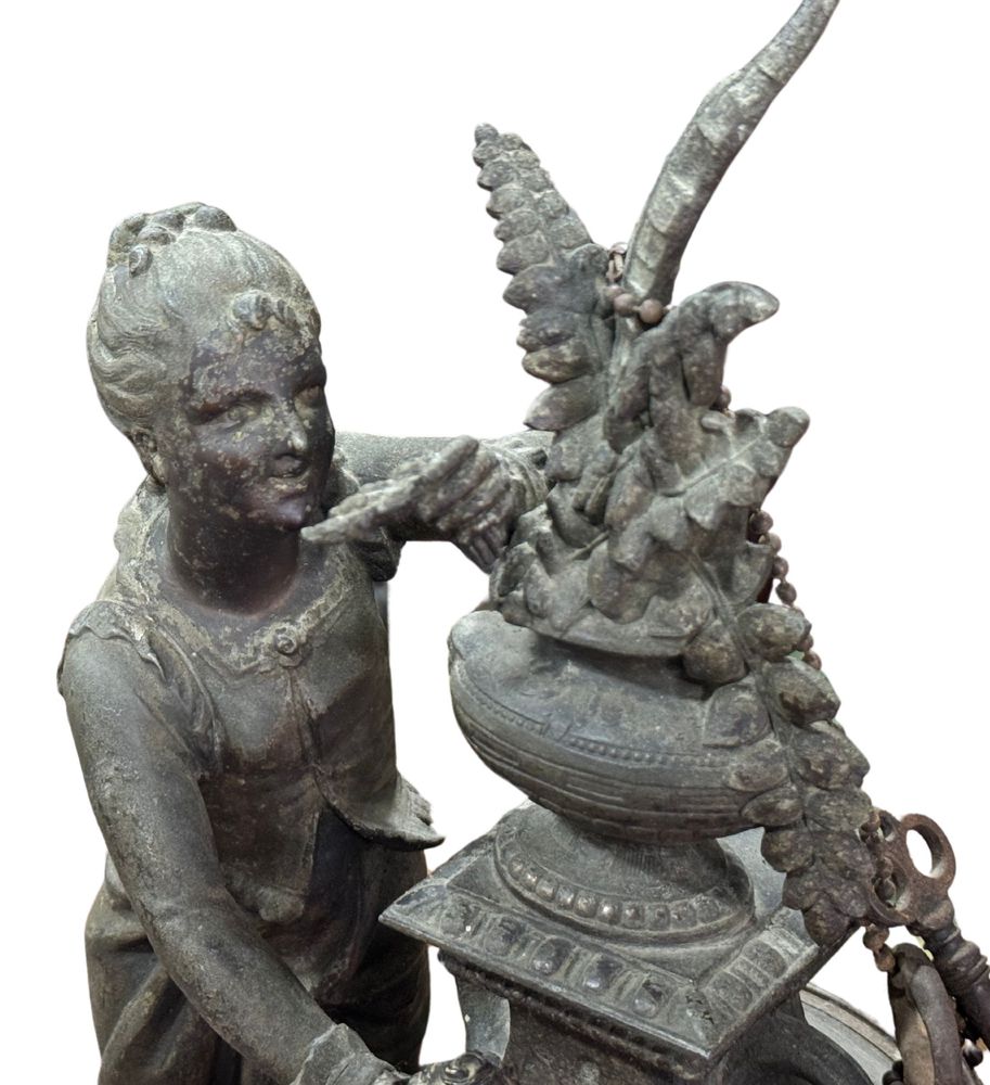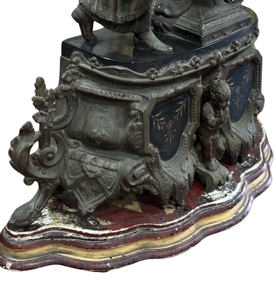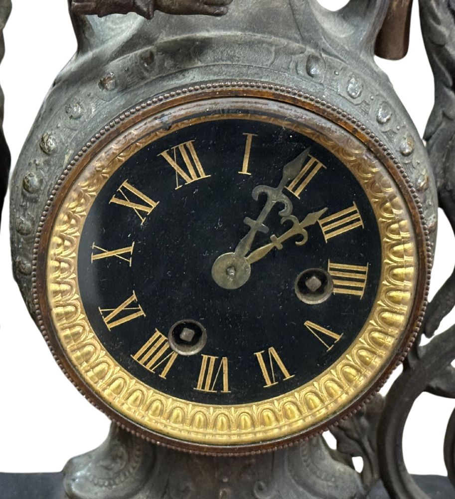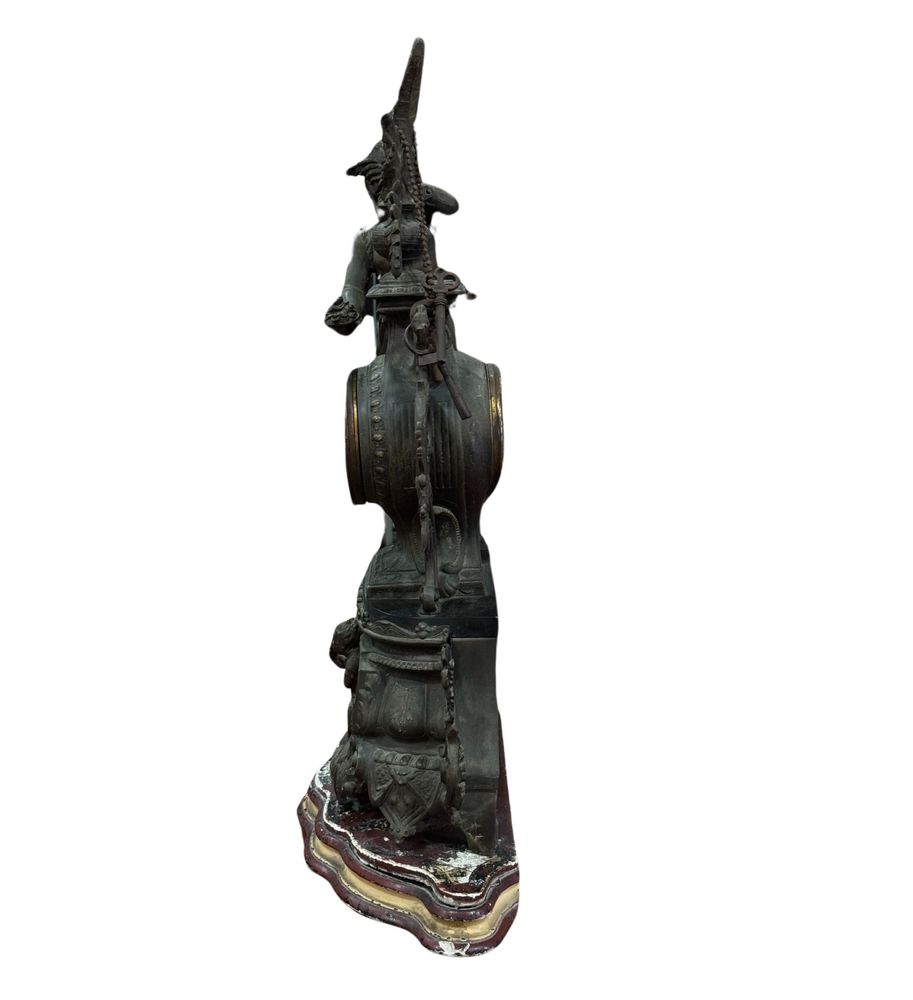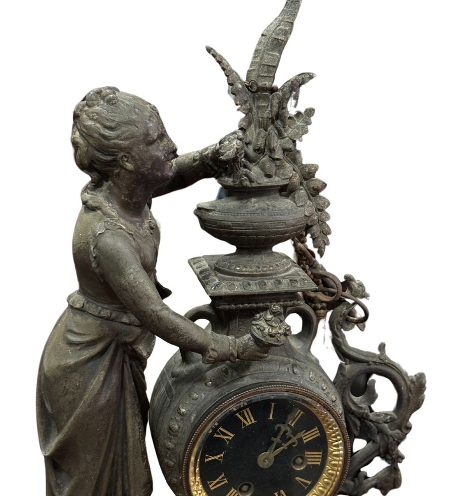 Orologio in metallo antimonio, periodo XIX/XX secolo. Dimensioni: h56x40 cm. Orologio in discrete condizioni con segni di vissuto e mancanze come da foto allegate.