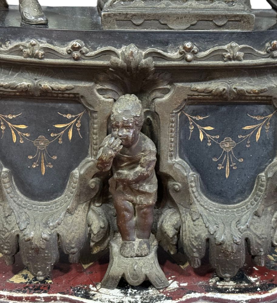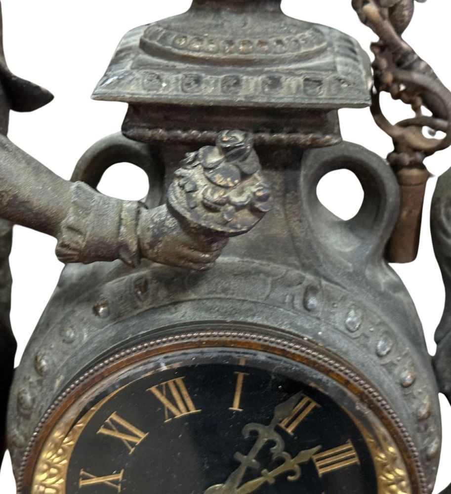 Orologio in metallo antimonio, periodo XIX/XX secolo. Dimensioni: h56x40 cm....