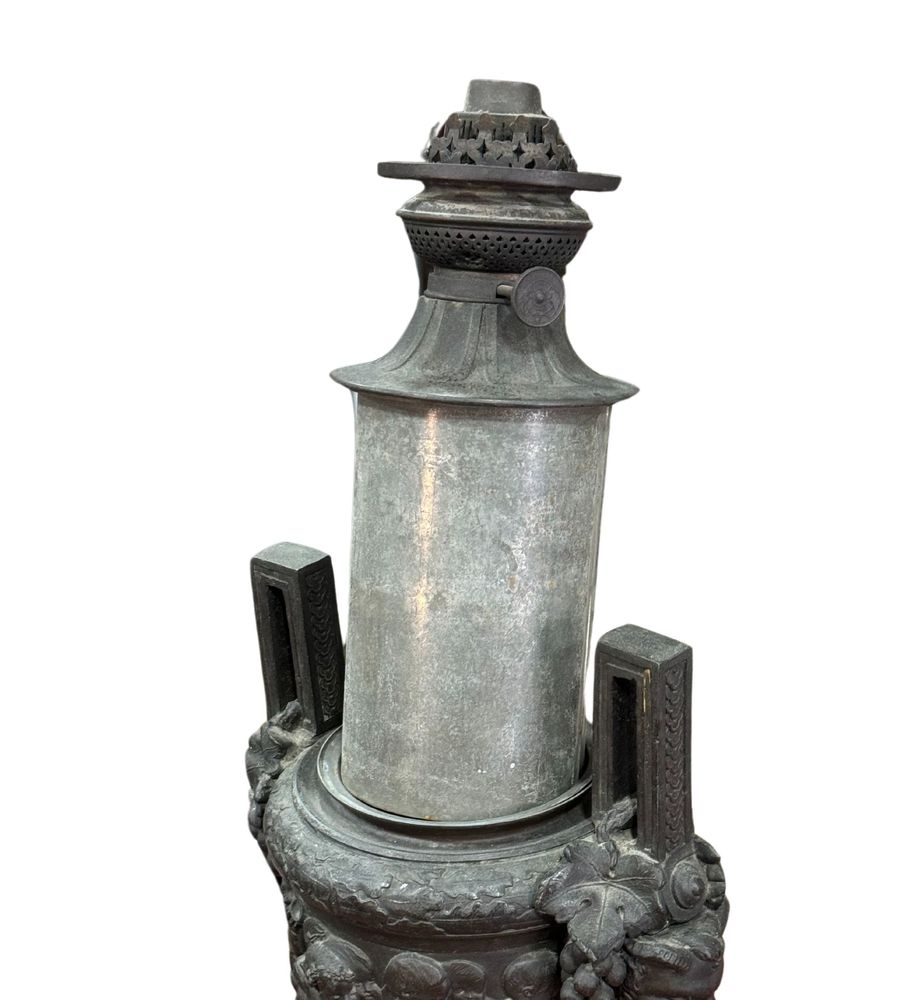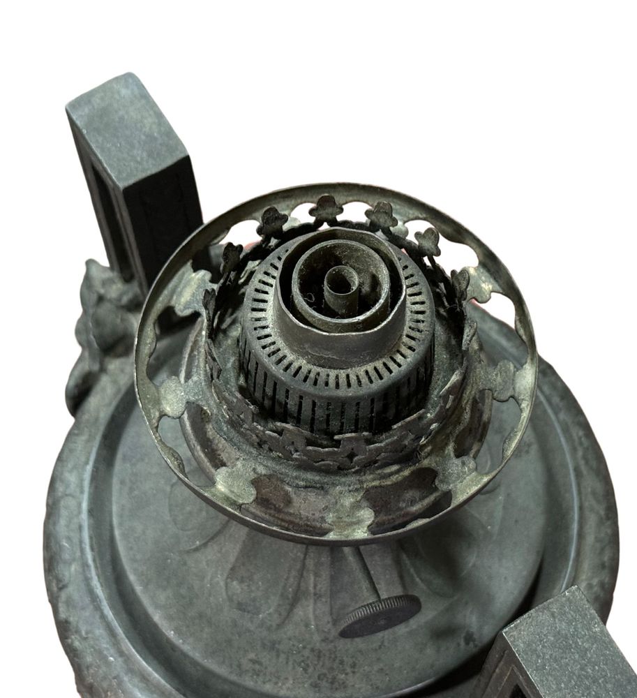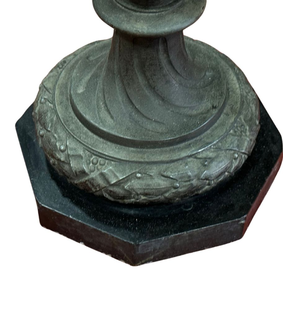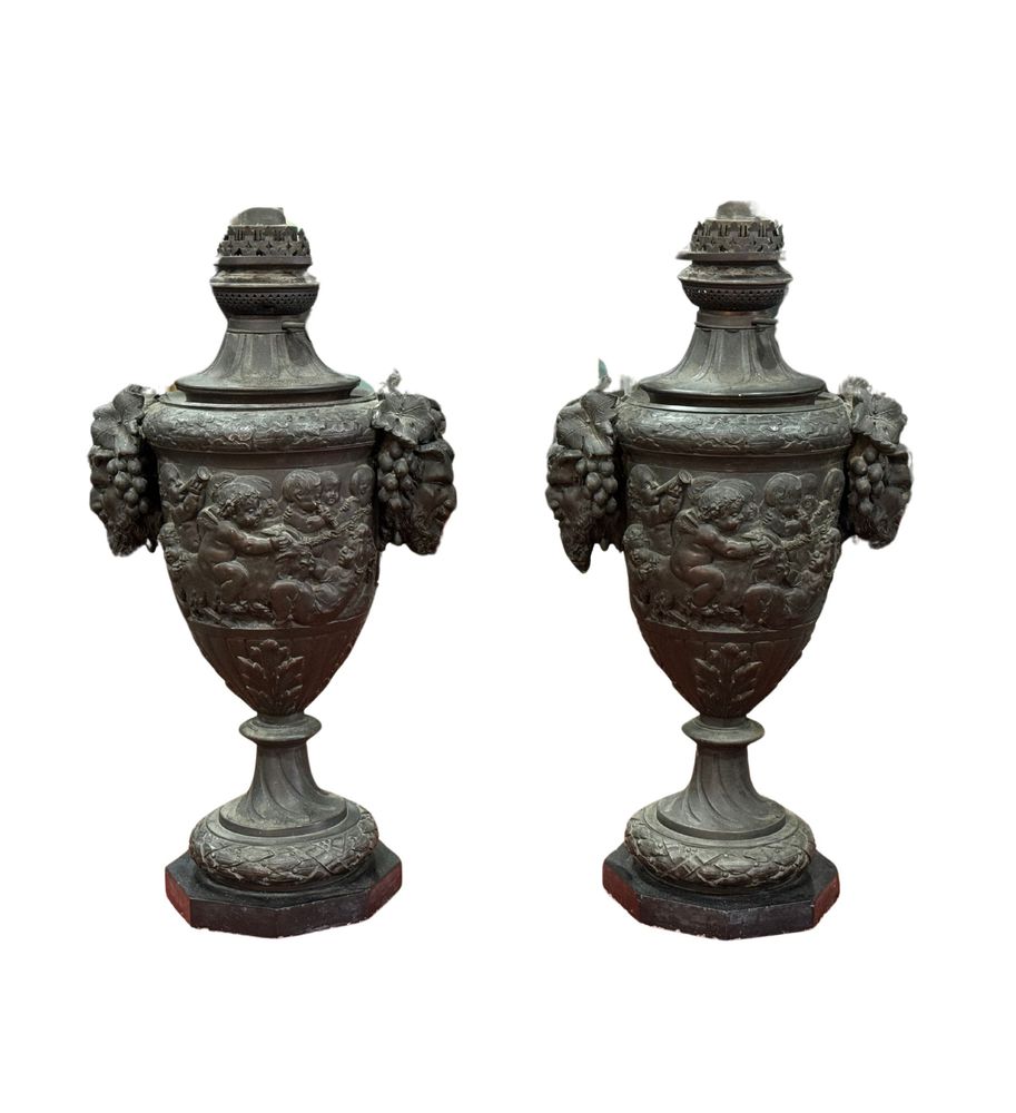Coppia di caselle in antimonio patinato con decorazioni, periodo XIX secolo. Dimensioni: H45x27 cm cadauno. In buone condizioni da segnalare la mancanza dei globi in vetro.