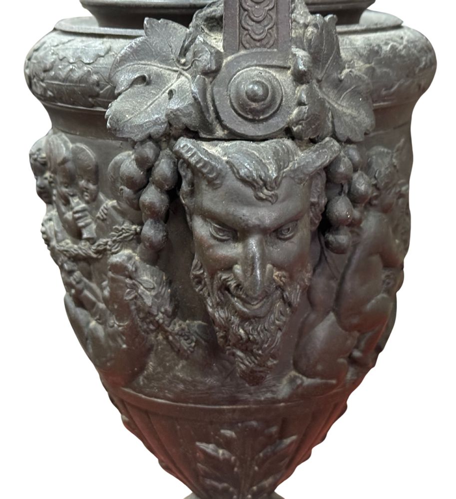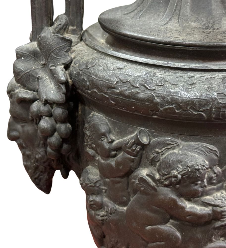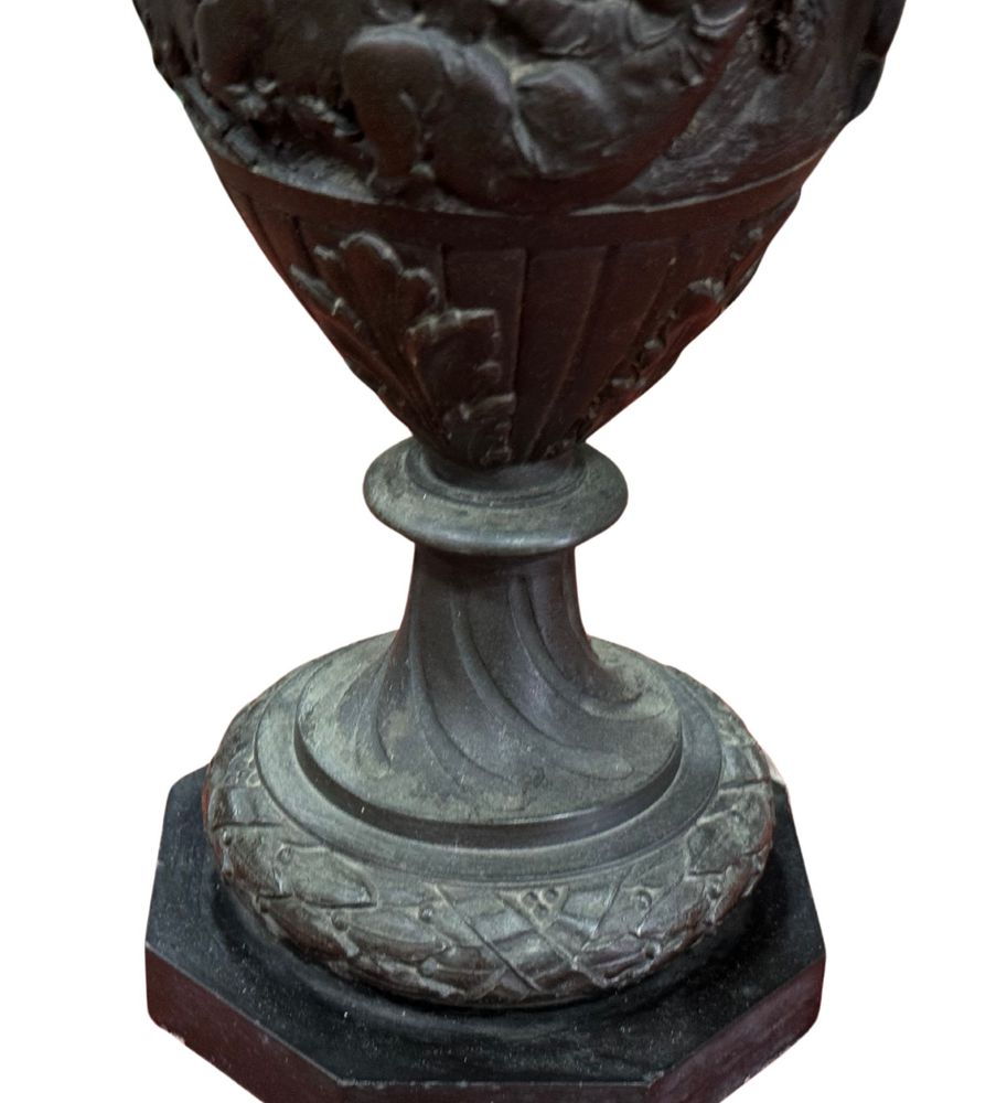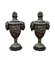 Coppia di caselle in antimonio patinato con decorazioni, periodo XIX secolo. Dimensioni: H45x27 cm cadauno. In buone condizioni da segnalare la mancanza dei globi in vetro.