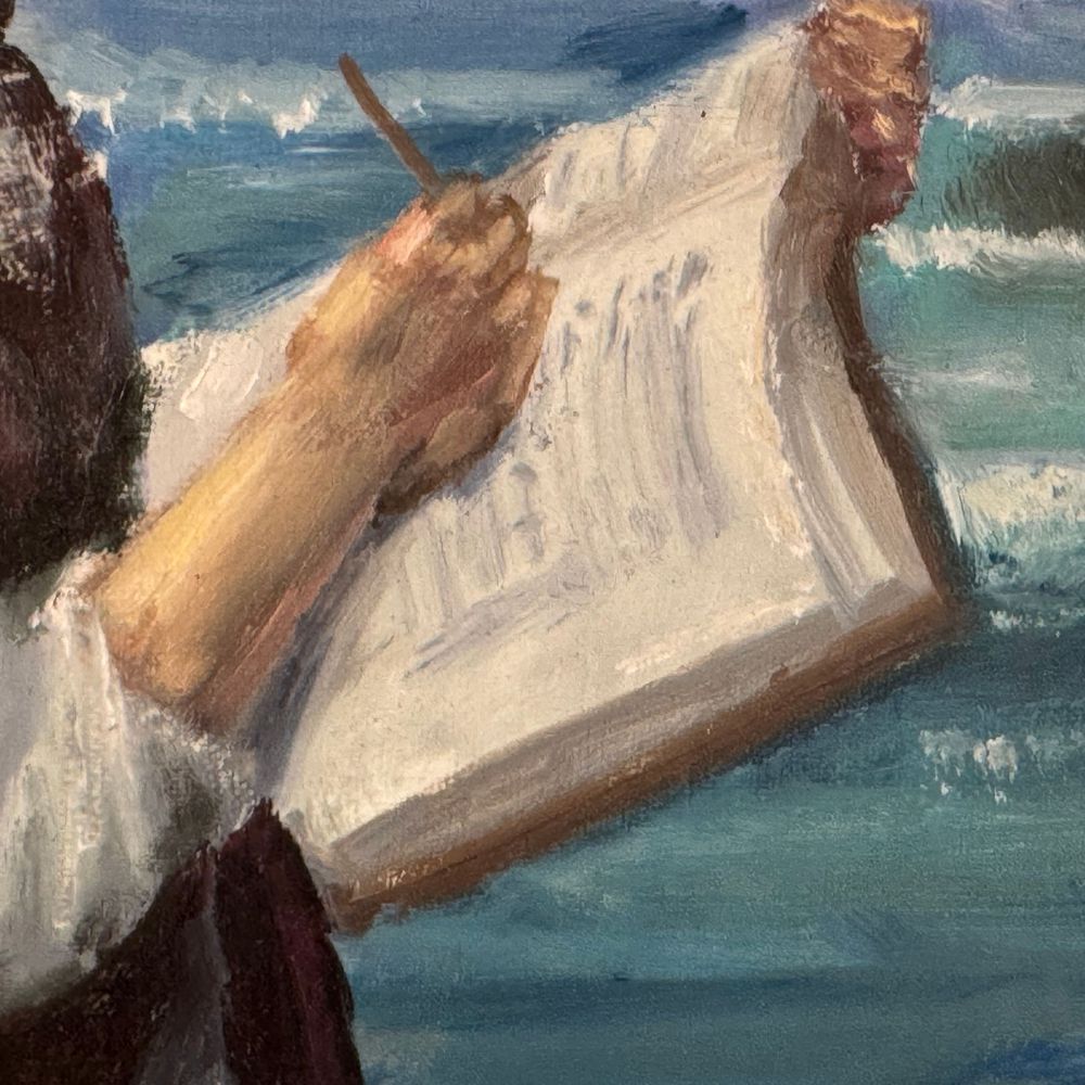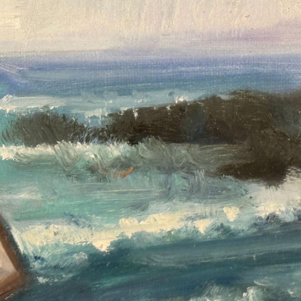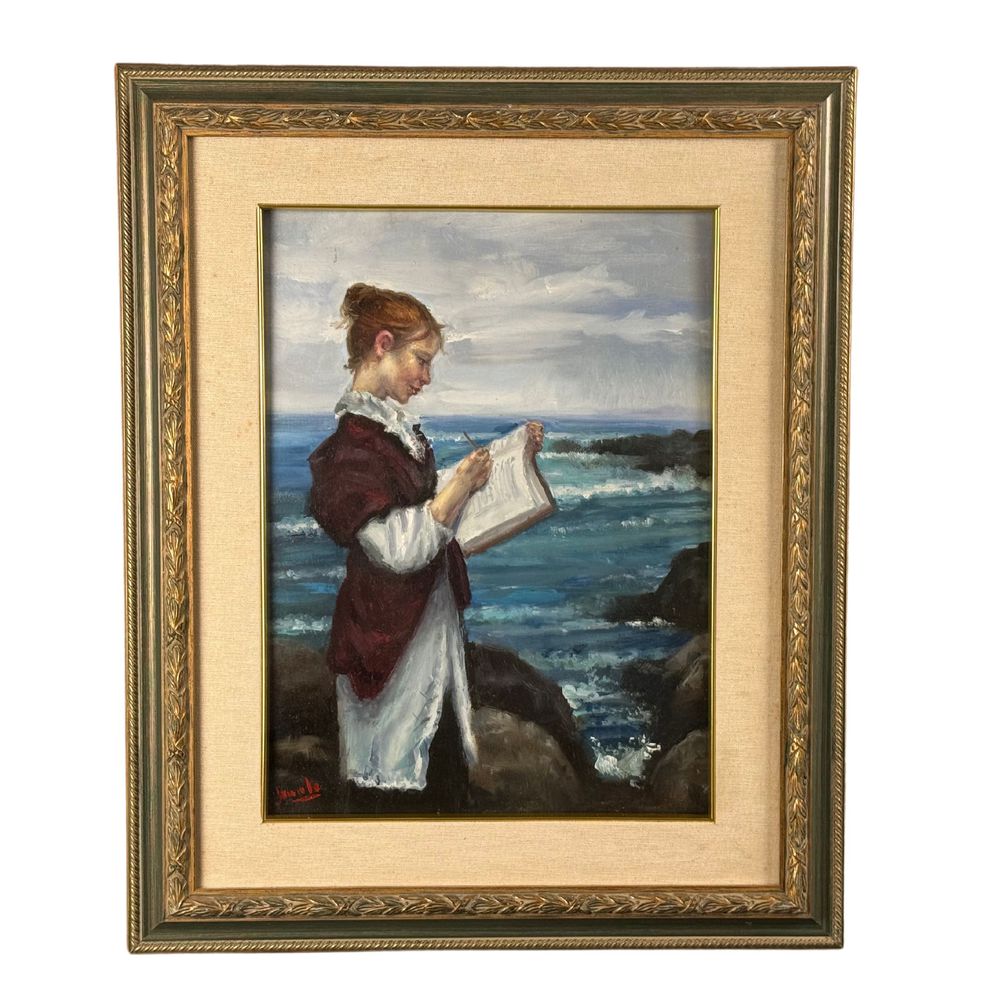Dipinto olio su tela applicata su cartoncino, periodo XX secolo scuola italiana, raffigurante Donna in lettura su marina. Dimensioni interno cornice: 30x40 cm. Dimensioni compreso cornice: 46x56 cm. Reca firma in basso a sinistra da artista non identificato. Opera in buone condizioni.