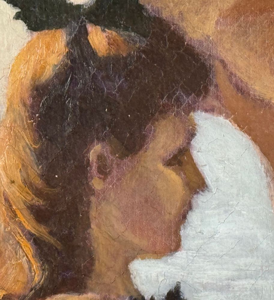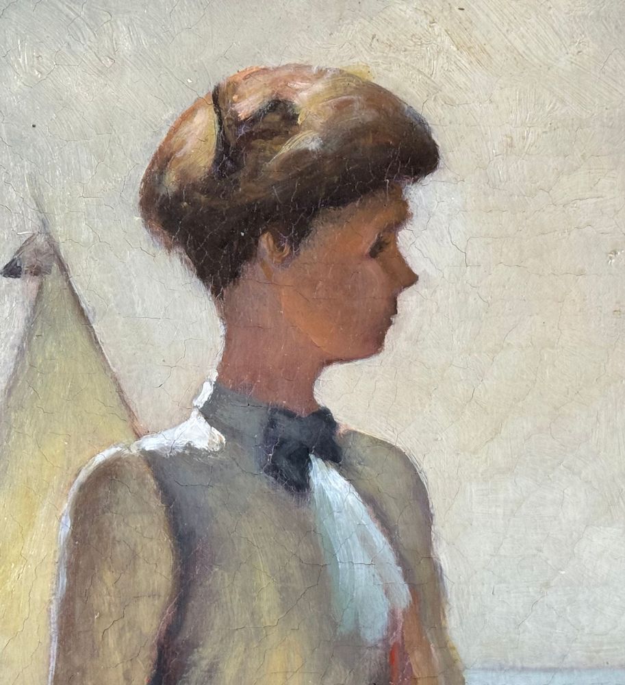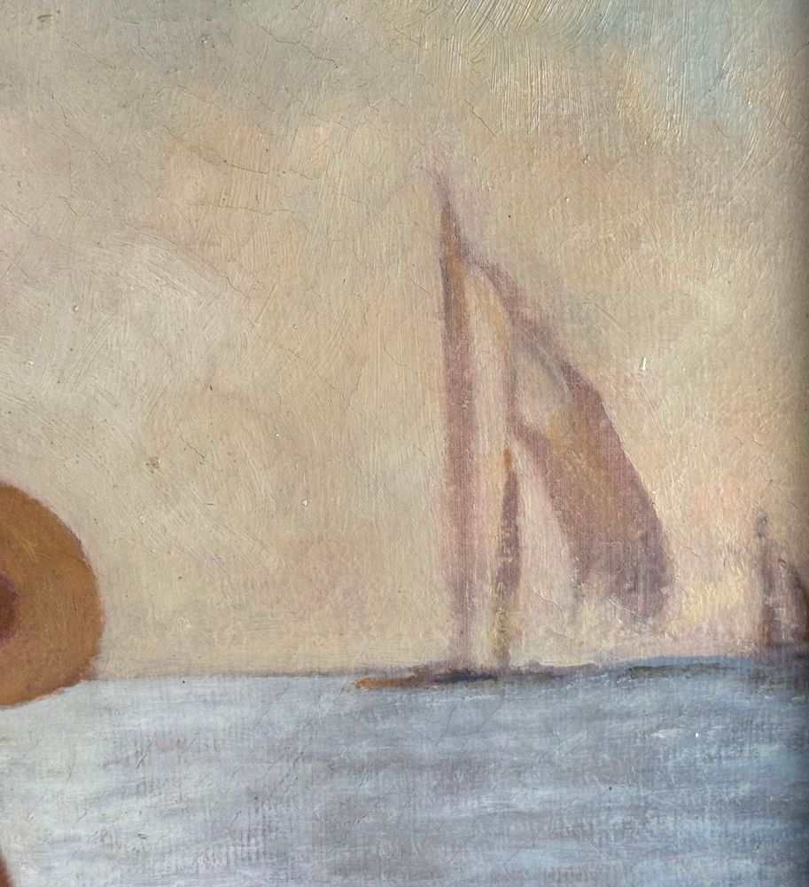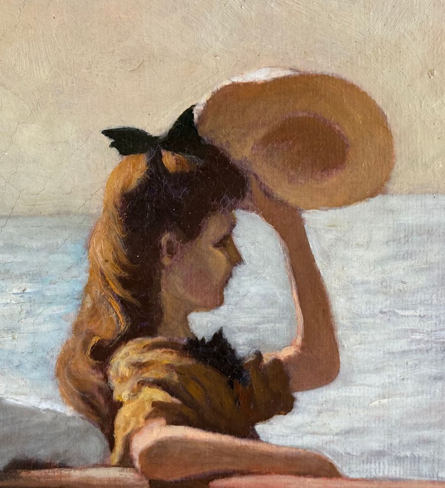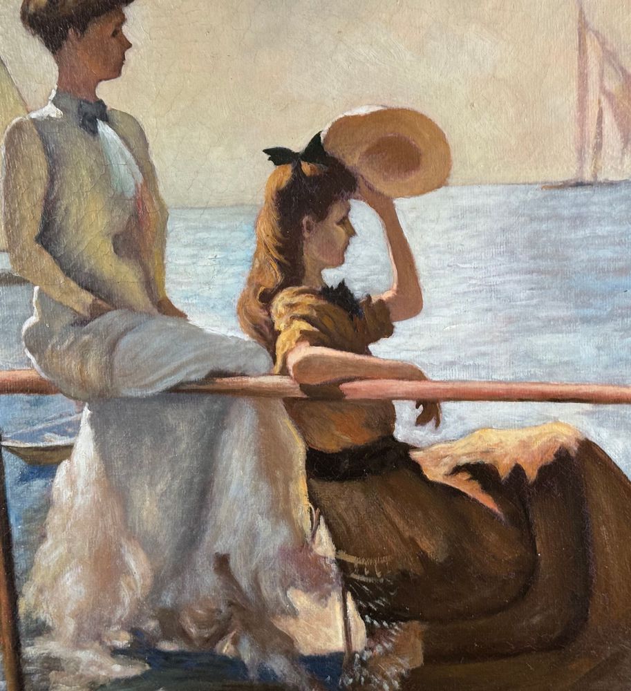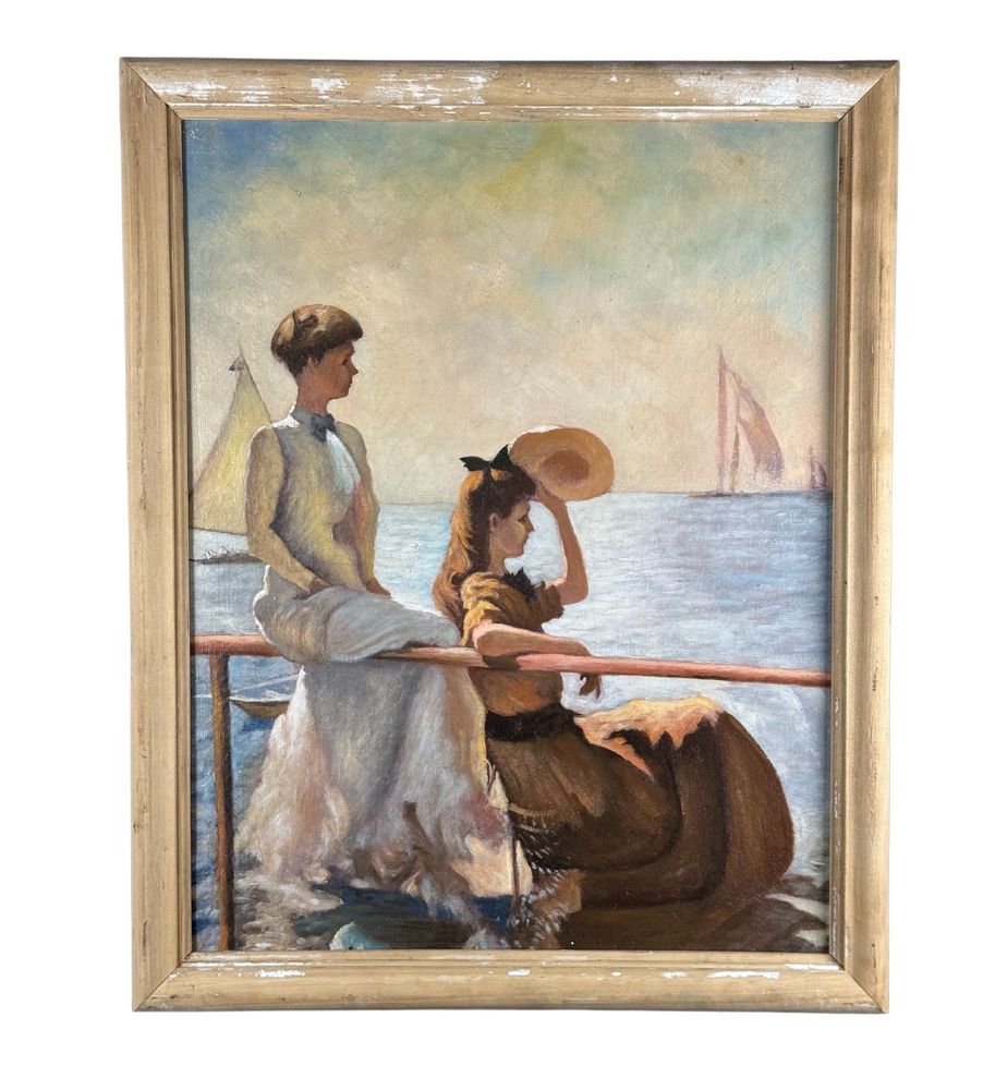 Dipinto olio su tela, periodo XX secolo 1952 scuola Italiana, raffigurante Due donne su marina. Tratta da un opera di Frank Benson. Dimensioni compreso cornice: 59,5x73,5 cm. Dimensioni interno cornice: 51,5x65,5 cm. Da artista anonimo. Opera in buone condizioni.