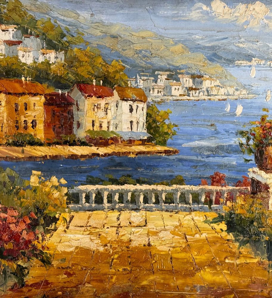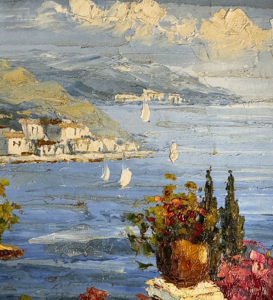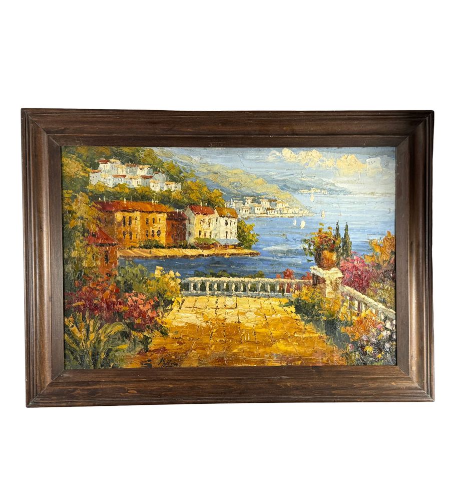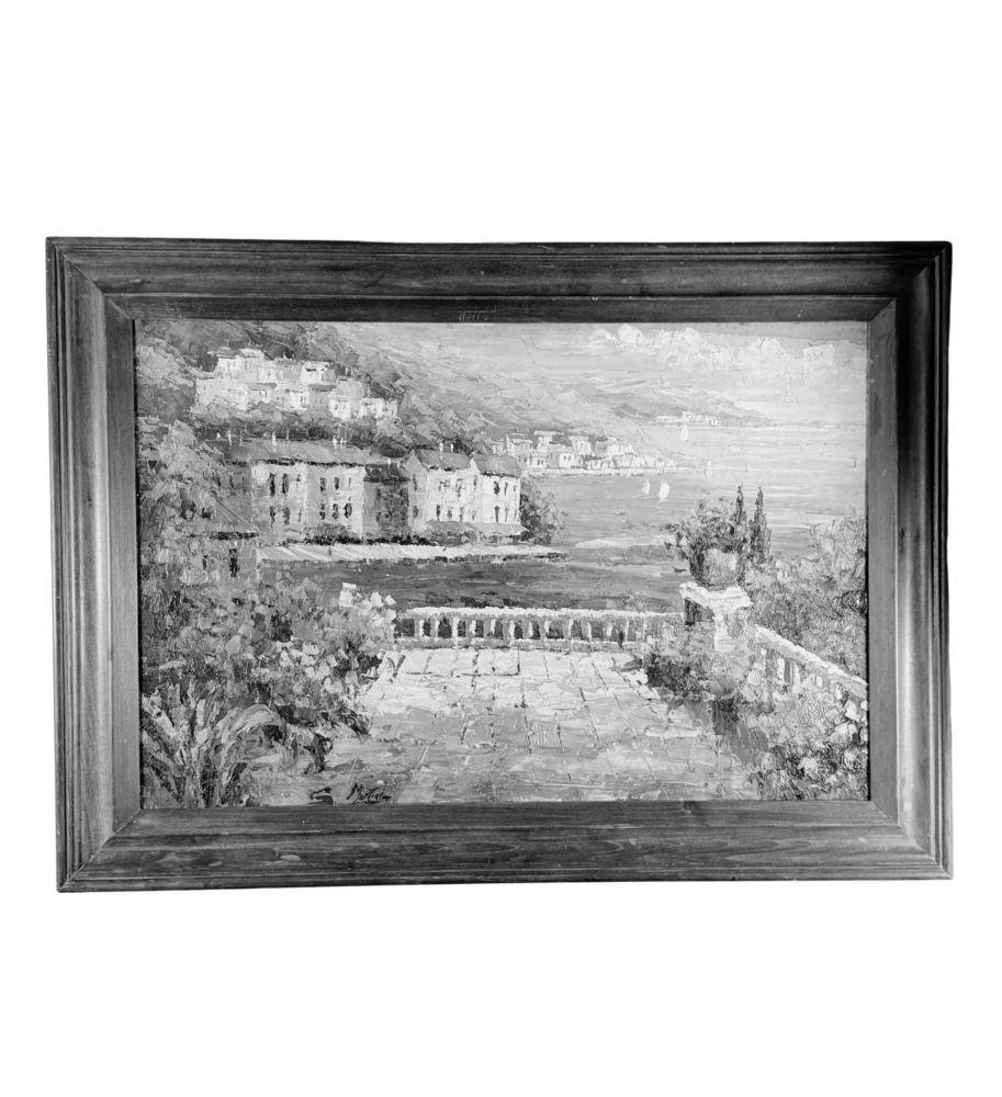 Dipinto olio su tela, periodo prima metà del XX secolo scuola Italiana, raffigurante Costiera. Dimensioni compreso cornice: 108x78 cm. Dimensioni interno cornice: 90x60 cm. Reca firma in basso a sinistra da artista non identificato. Opera in buone condizioni.