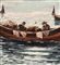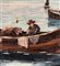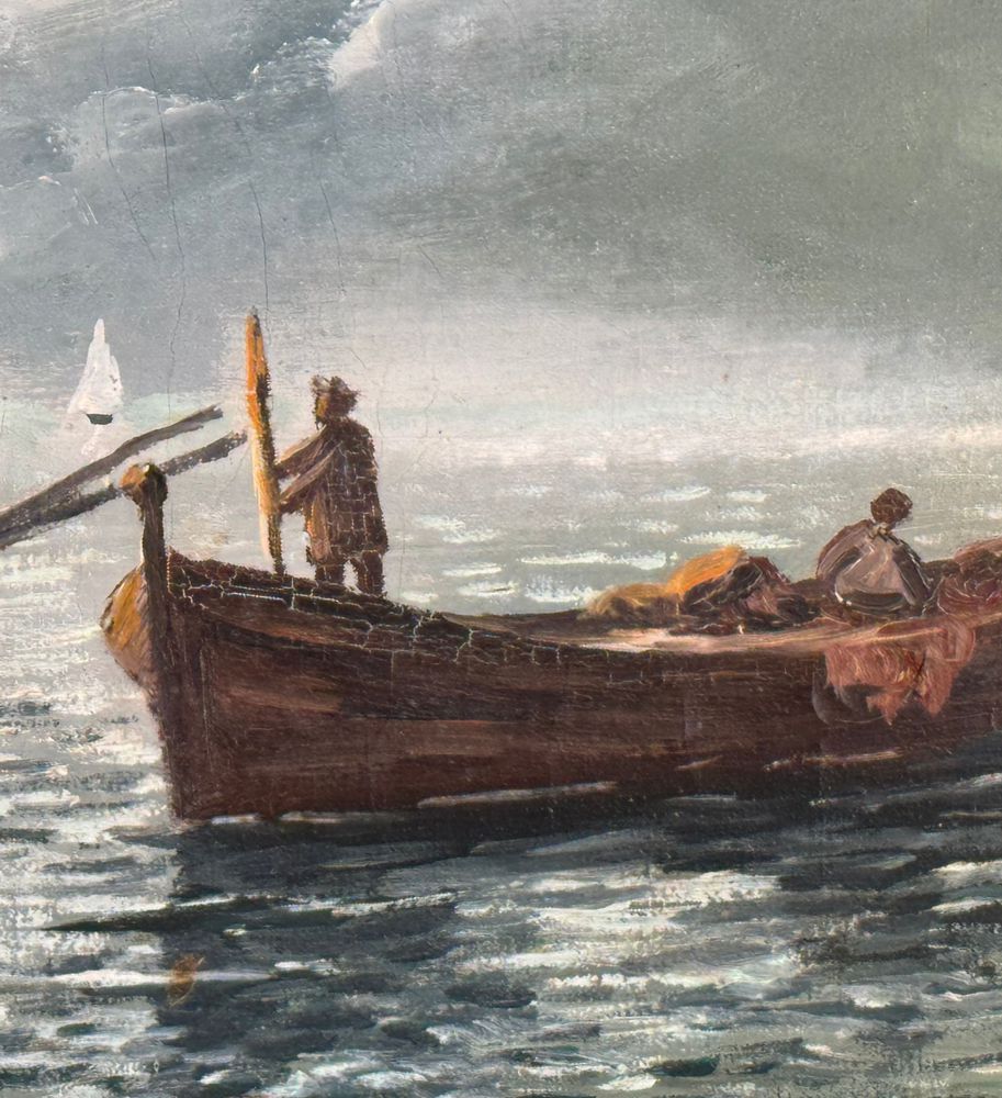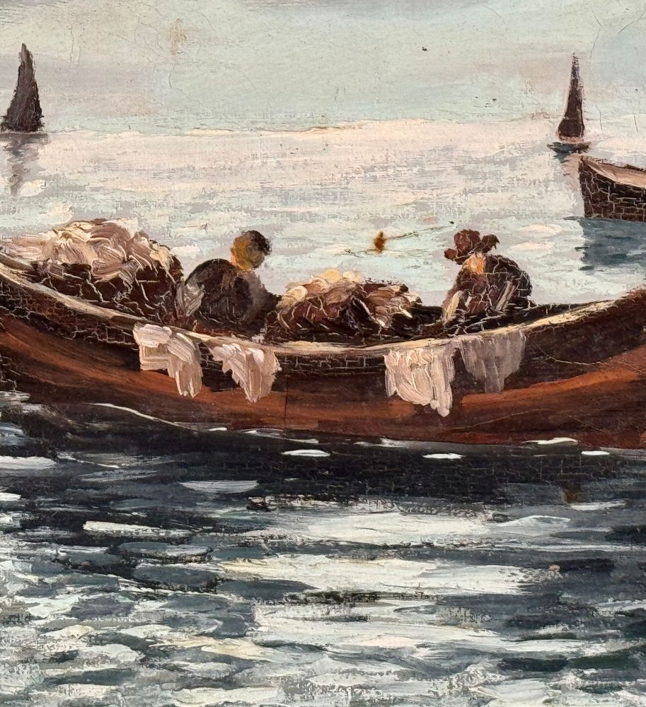 Dipinto olio su tela, periodo XX secolo scuola Napoletana, raffigurante Pescatori in barca. Dimensioni compreso cornice: 77x57 cm. Dimensioni interno cornice: 70x50 cm. Reca firma in basso a destra da artista non identificato. Opera in buone condizioni.