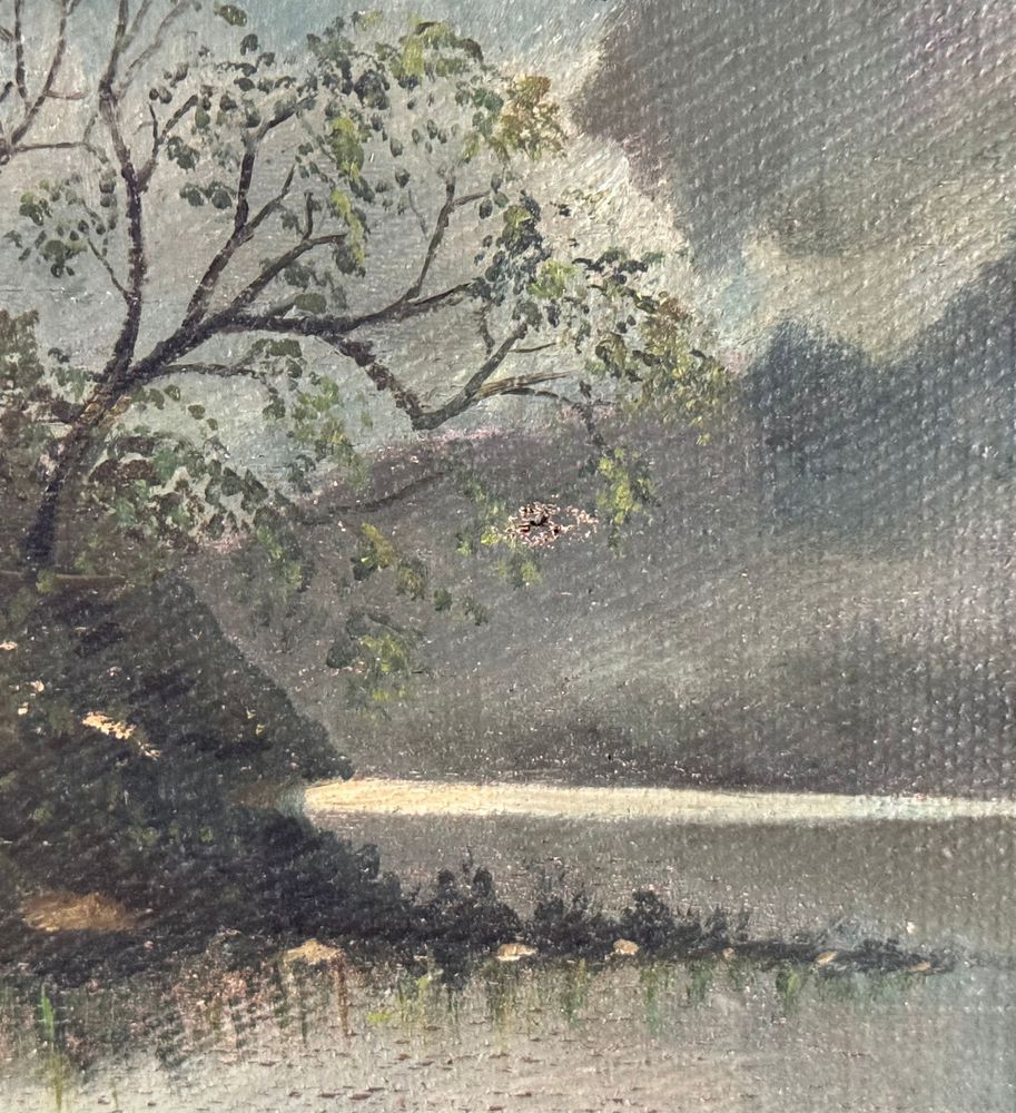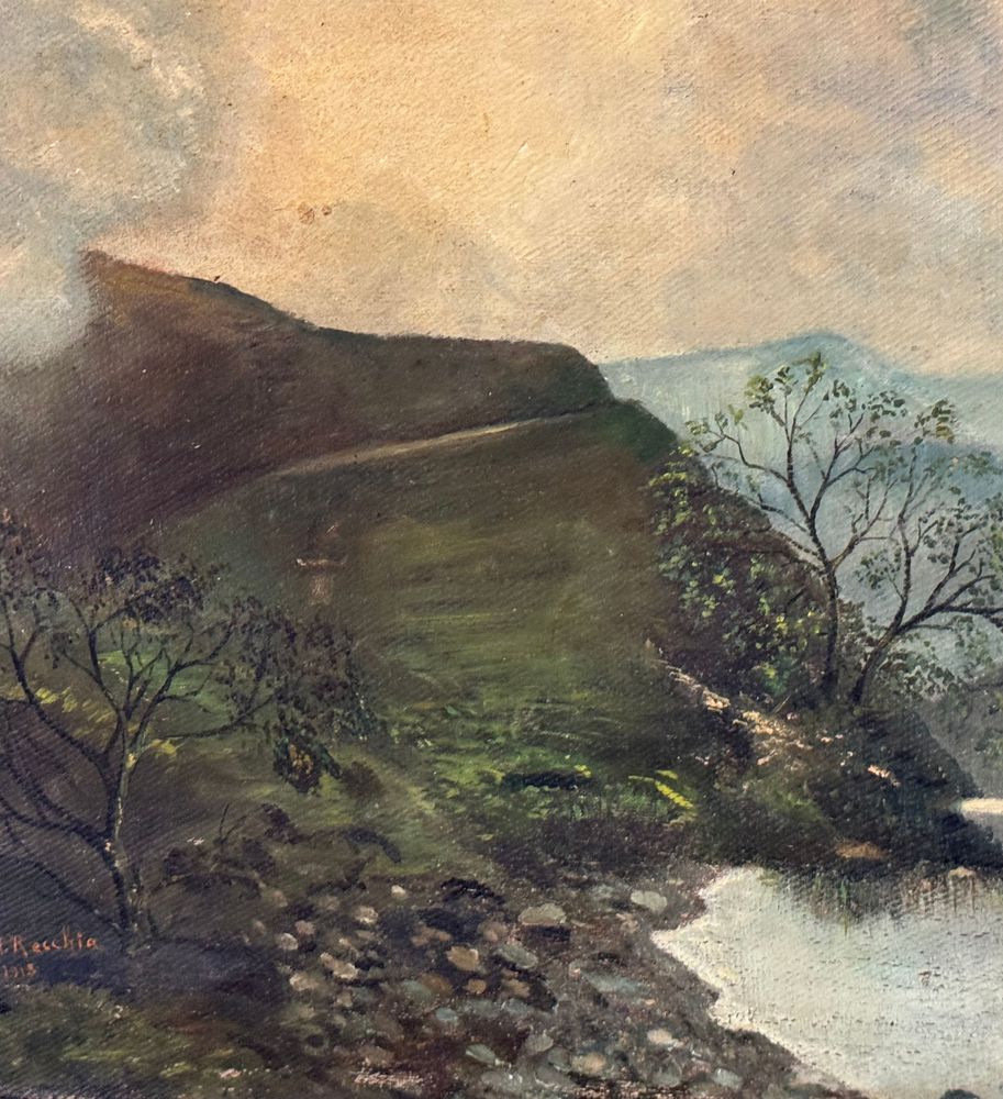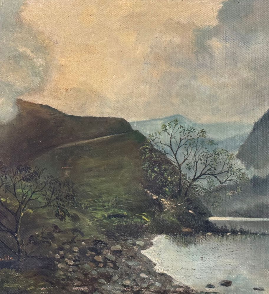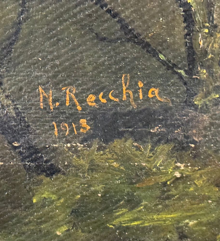 Dipinto olio su tela, periodo XX secolo (1913) scuola Italiana, raffigurante Paesaggio con lago. Dimensioni compreso cornice: 84x72 cm. Dimensioni interno cornice: 63x50 cm. Reca firma in basso a sinistra M. Recchia. Opera in buone condizioni, con lievi segni di vissuto come da foto allegate.