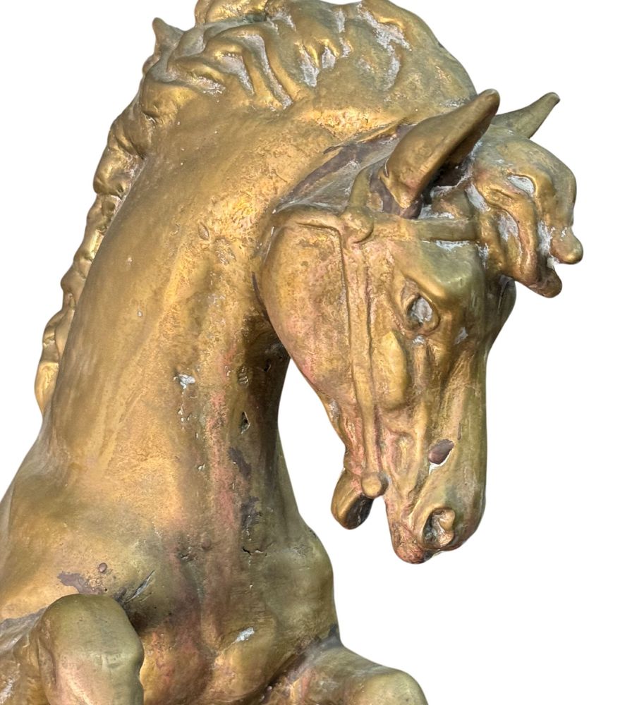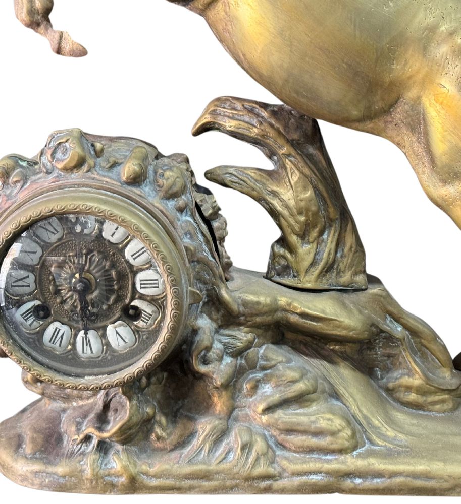 Orologio in bronzo dorato, periodo inizio XX secolo raffigurante Cavallo rampante. Dimensioni: h53x52x16 cm. Orologio da revisionare.