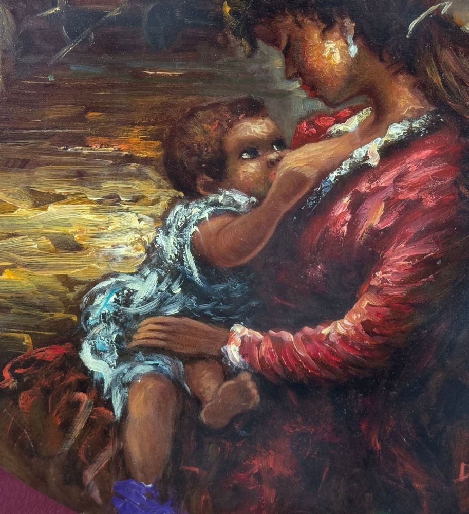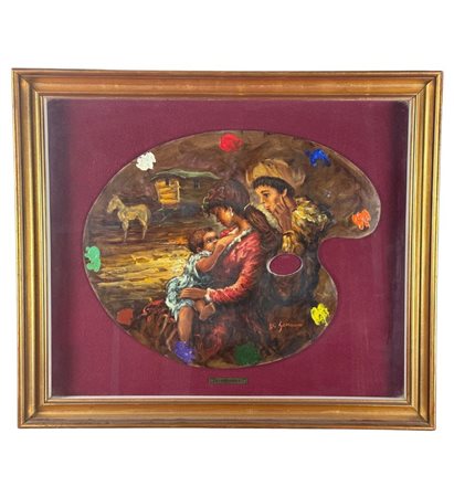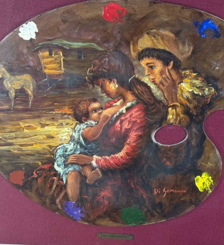 Dipinto olio su tavola, periodo XX secolo scuola Italiana, raffigurante Scena materna. Dimensioni compreso cornice: 67x57 cm. Dimensioni interno cornice: 49x39 cm. Reca firma in basso a destra Di Gennaro. Opera in buone condizioni.