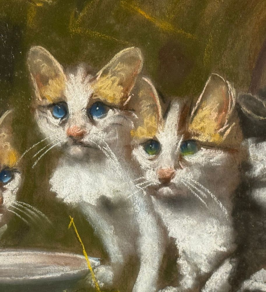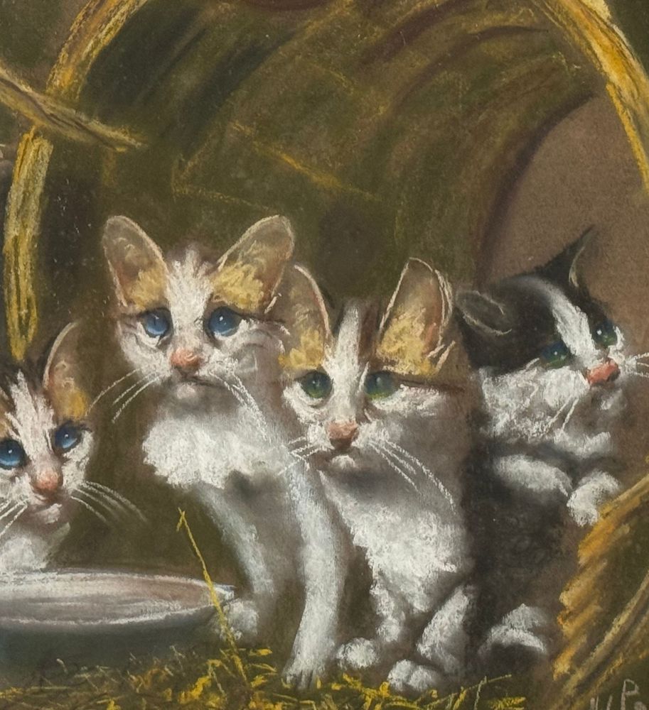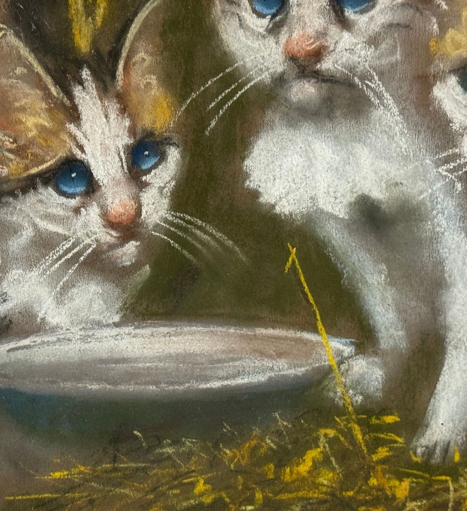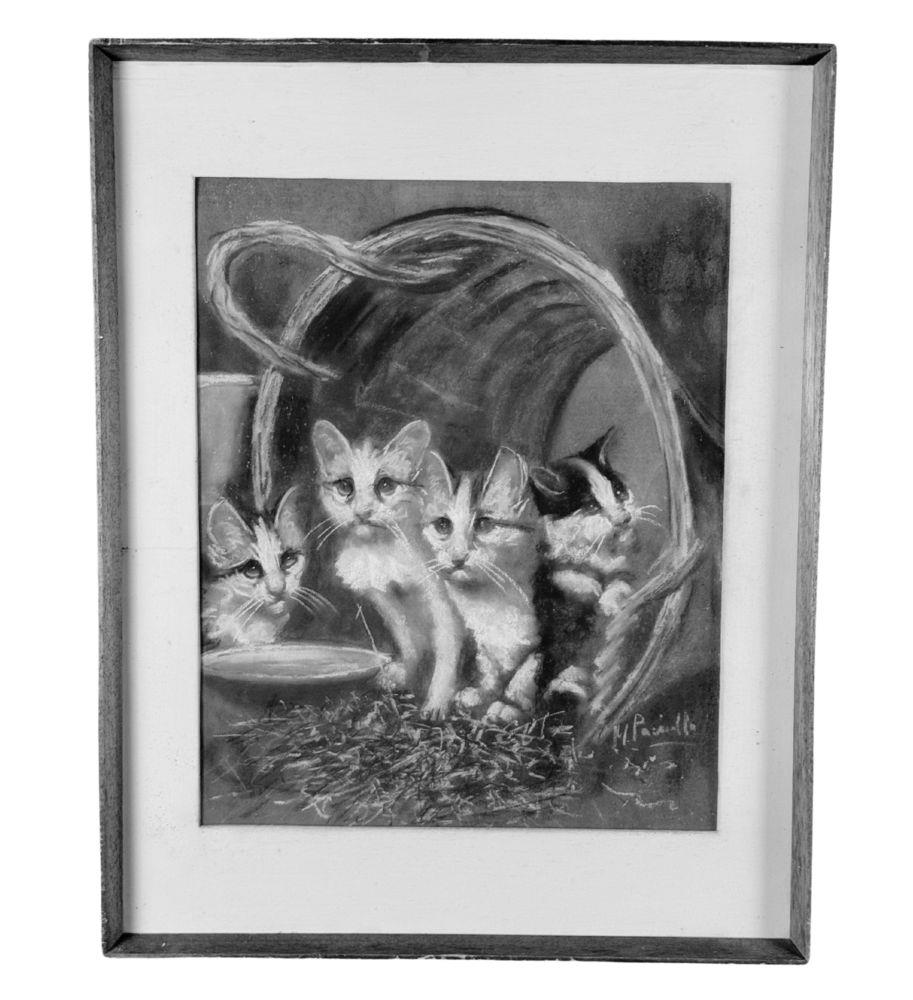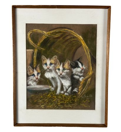 Tecnica mista su tavola, periodo XX secolo scuola Italiana, raffigurante Gattini. Dimensioni compreso cornice: 52x66 cm. Dimensioni interno cornice: 40x50 cm. Reca firma in basso a destra Paciullo. Opera in buone condizioni.