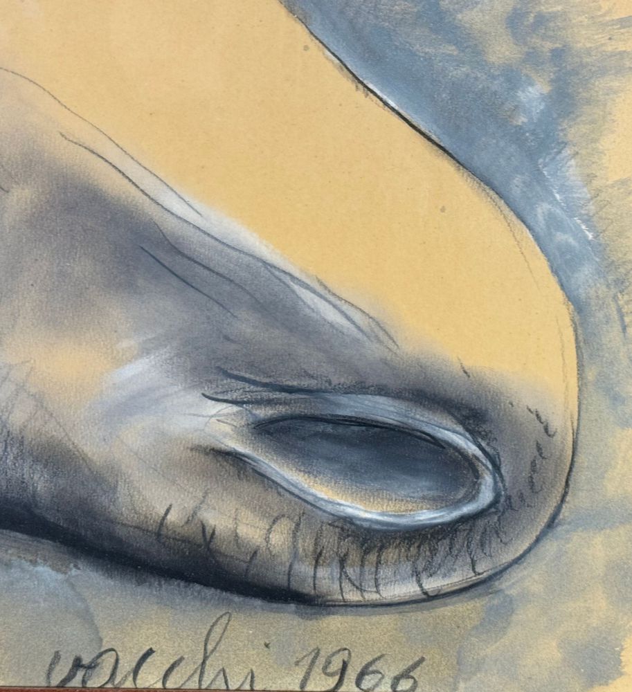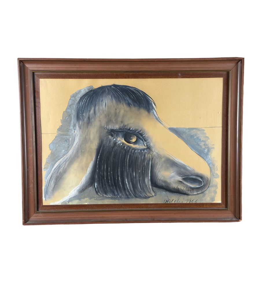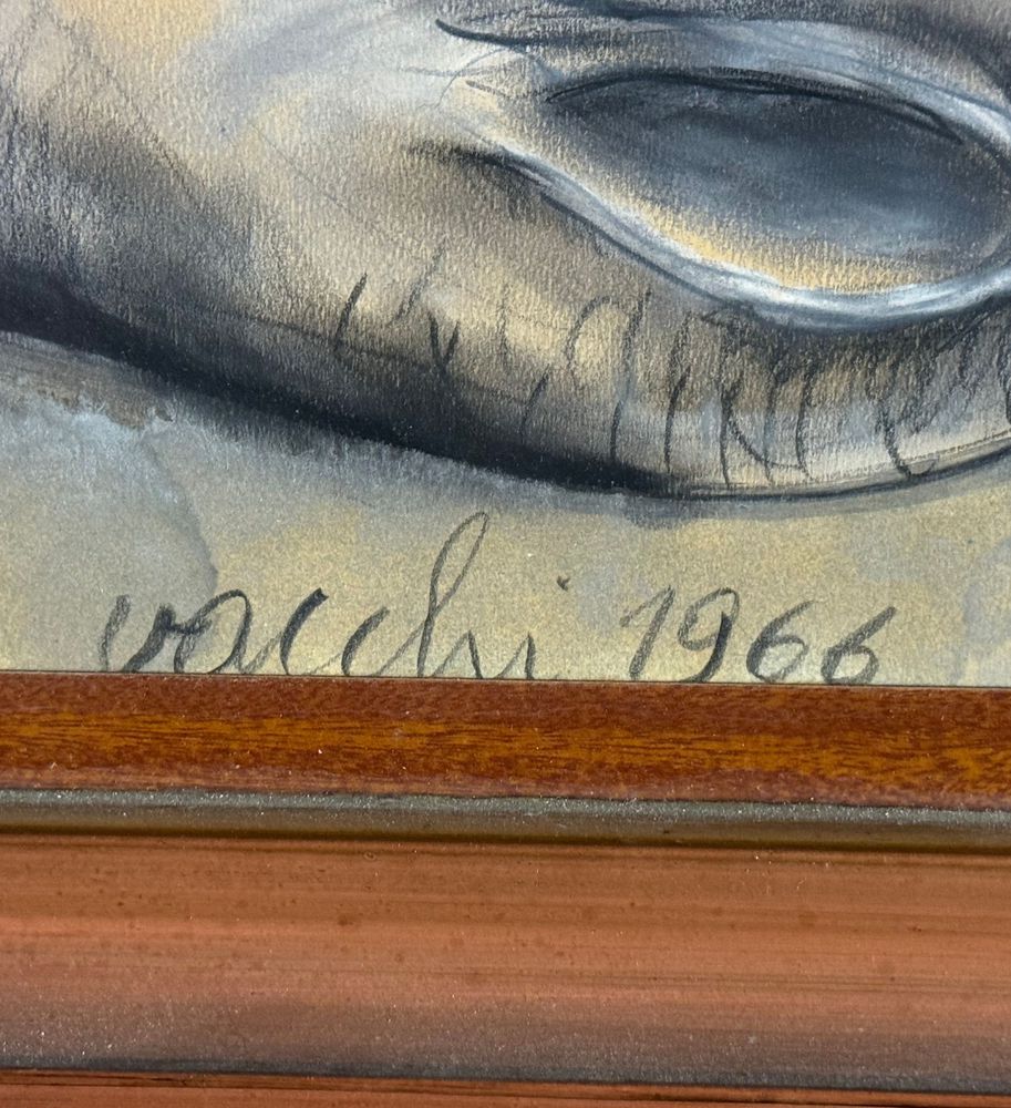 Tecnica mista su carta, periodo 1966 scuola Italiana, raffigurante SENZA TITOLO. Dimensioni compreso cornice: 78x58 cm. Dimensioni interno cornice: 65x45 cm. Reca firma in basso a destra Vacchi (1966). Opera in buone condizioni. Artista non identificato