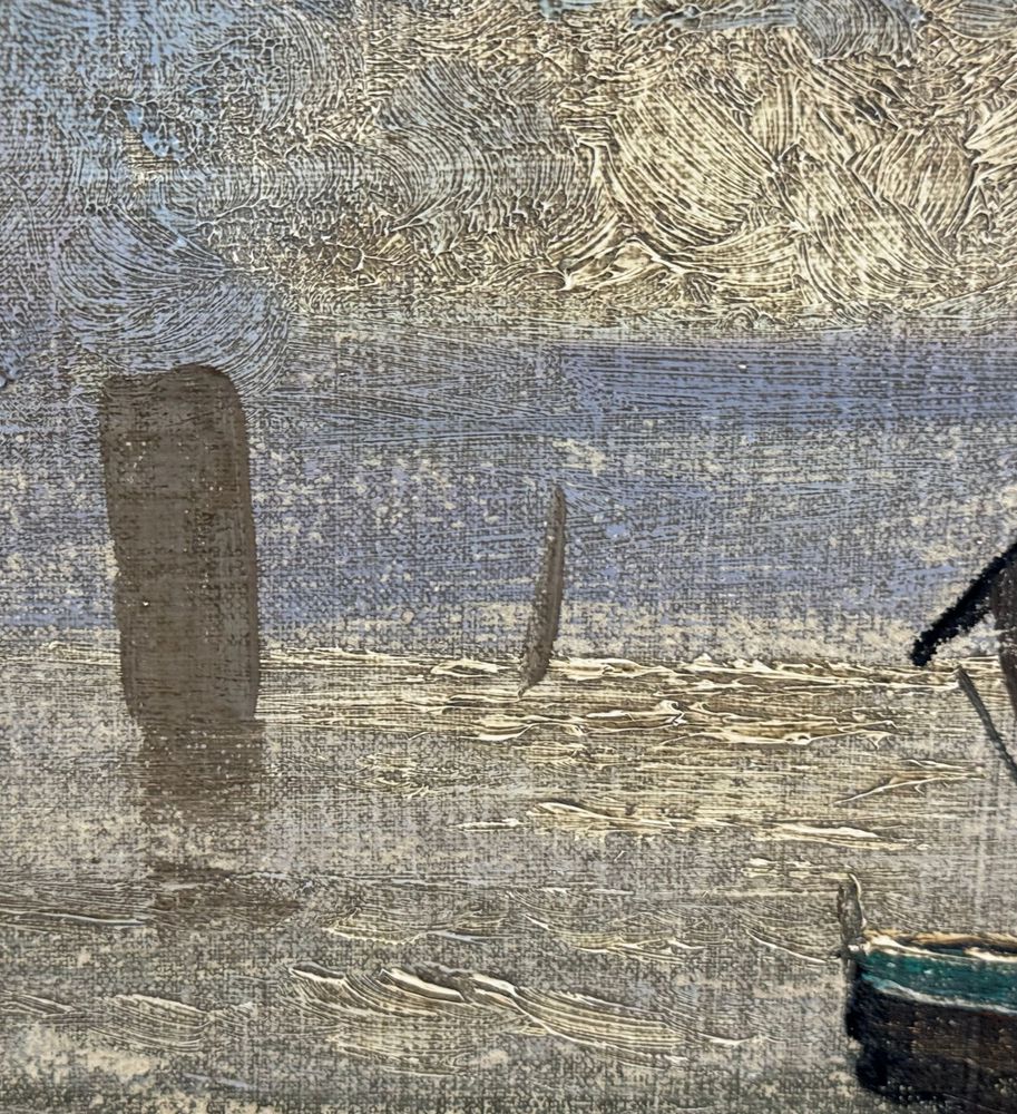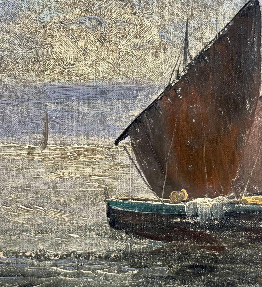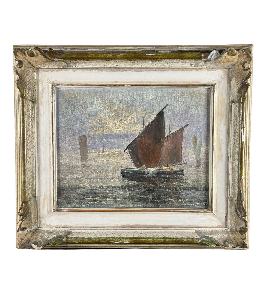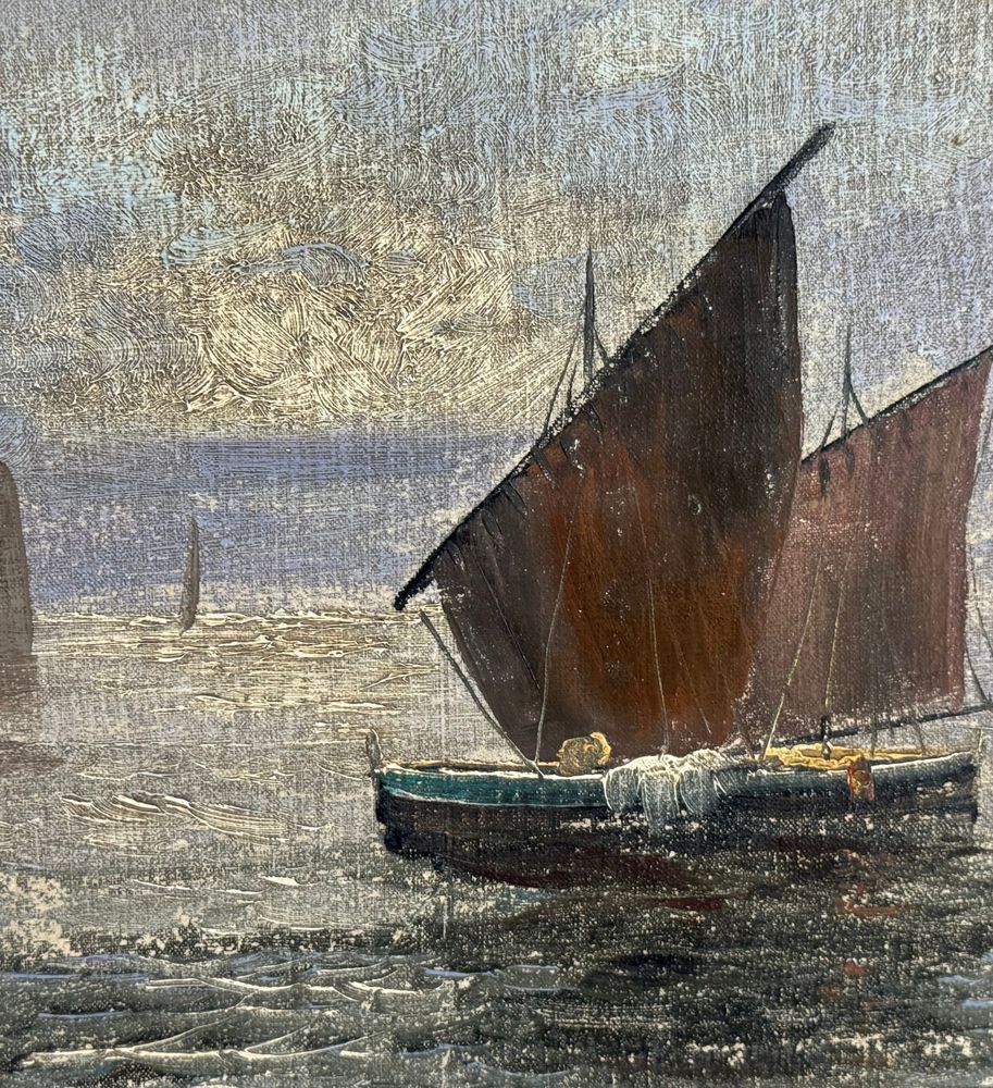 Dipinto olio su tela applicata su cartoncino, periodo XX secolo scuola Italiana, raffigurante Scorcio di marina napoletana. Dimensioni compreso cornice: 44x39 cm. Dimensioni interno cornice: 30x24 cm. Artista anonimo. Opera in buone condizioni con lievi segni di vissuto come da foto allegate.