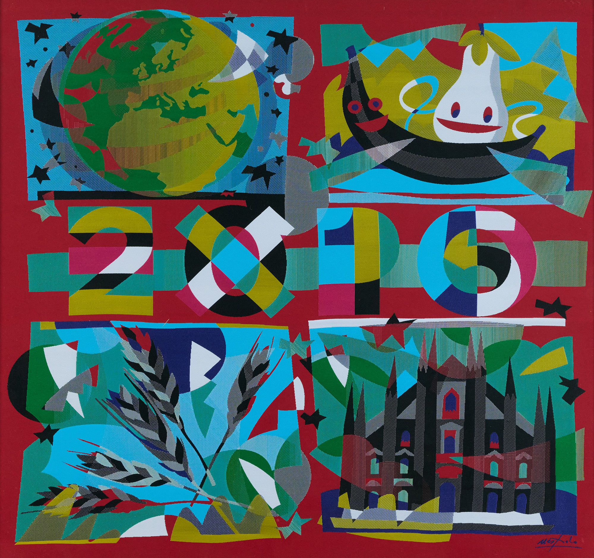 Ugo Nespolo (Mosso Santa Maria (Bi), 1941) Expo, 2015 Arazzo cm. 64x68...