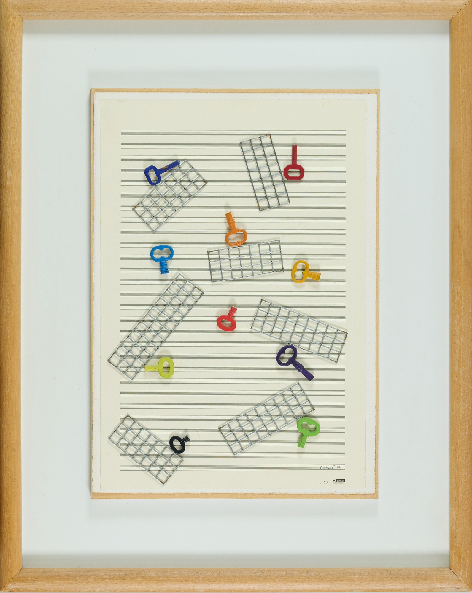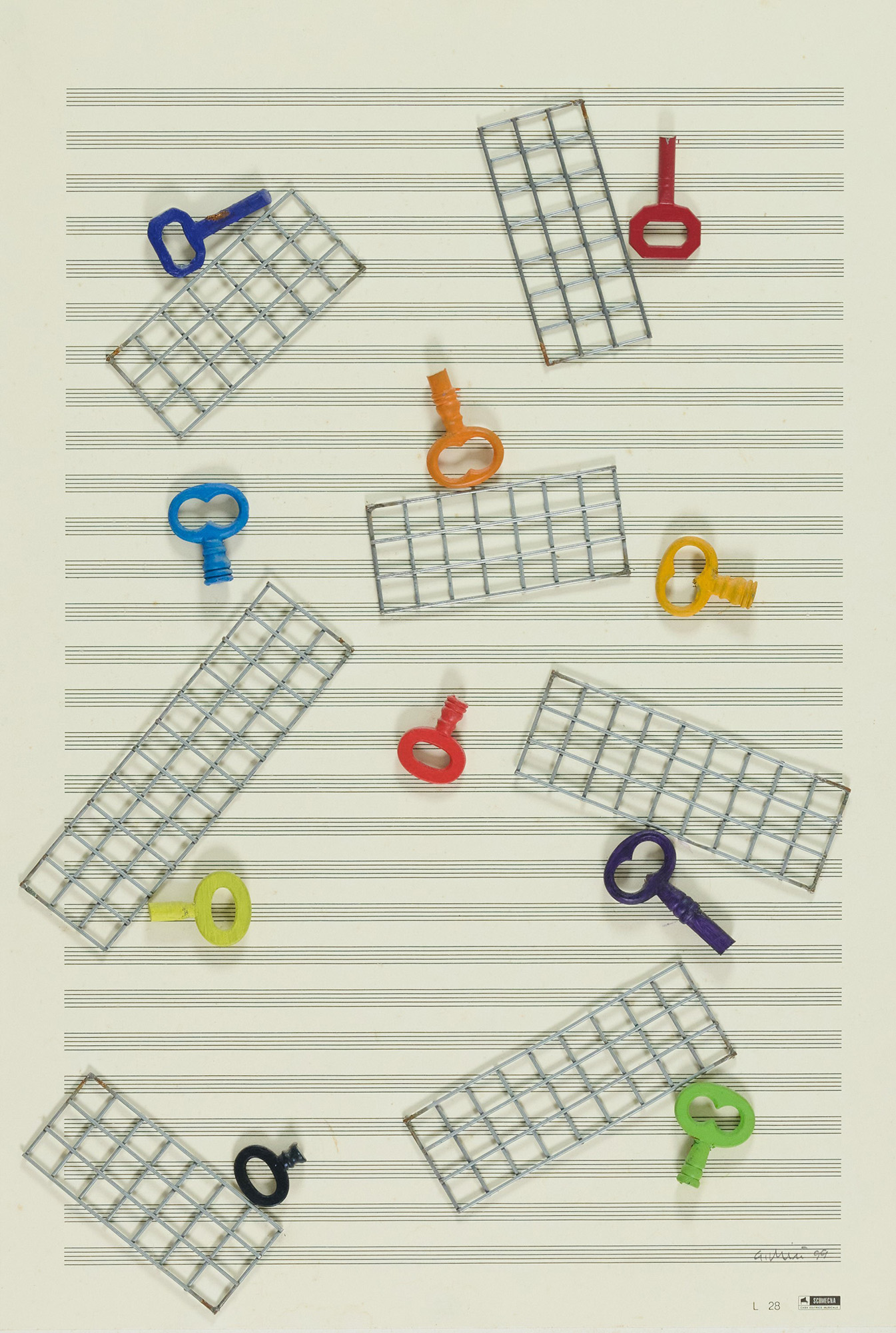 Accomulazione di oggetti su spartito musicale applicato su cartoncino applicato tavola